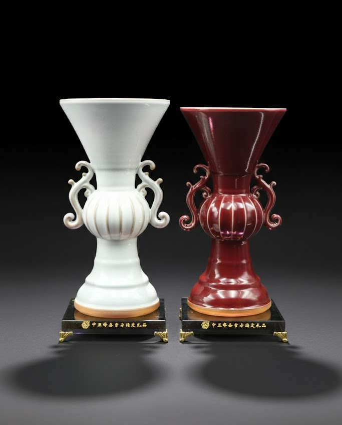 这组作品融合了青铜器“尊”的古朴造型与现代制瓷工艺的圆润线条。白色款(口径16.5cm、高31.5cm、底12cm)素洁如玉,温润含蓄;红色款(口径16.2cm、高30.7cm、底11.5cm)端庄典雅,气韵热烈。二者相映成辉,象征阴阳调和、天地共融的文化哲思。