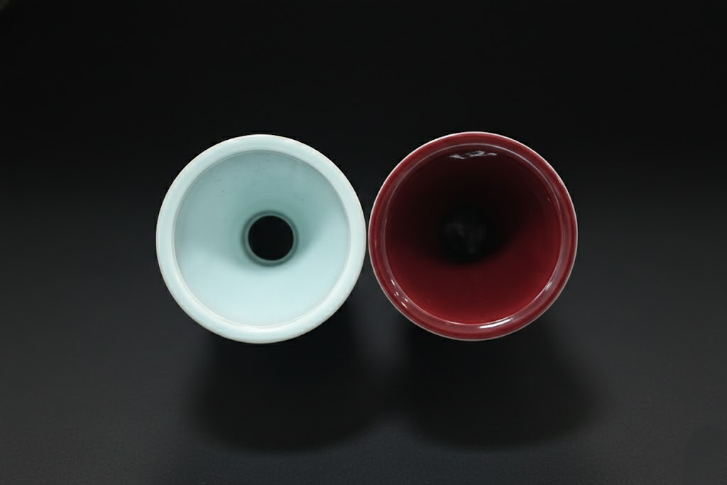 从俯瞰角度观赏,器口圆润端正,釉面延伸至底部,通体一气呵成。白釉款内壁清透含光,红釉款则呈现深沉如海的视觉层次。高温釉色在光照下幻化微妙变化,令人沉浸于静穆而庄雅的审美体验。