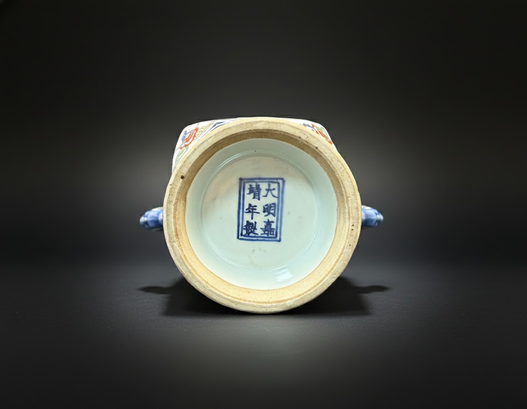 器底双圈内书“大明嘉靖年制”六字楷款,字体端庄遒劲。露胎处可见胎质坚硬洁白,釉色略泛青光,具有鲜明的嘉靖官窑特征。整体造型端稳,彩绘艳而不俗,融装饰性与仪礼性于一体,堪称嘉靖彩瓷工艺的代表之作。