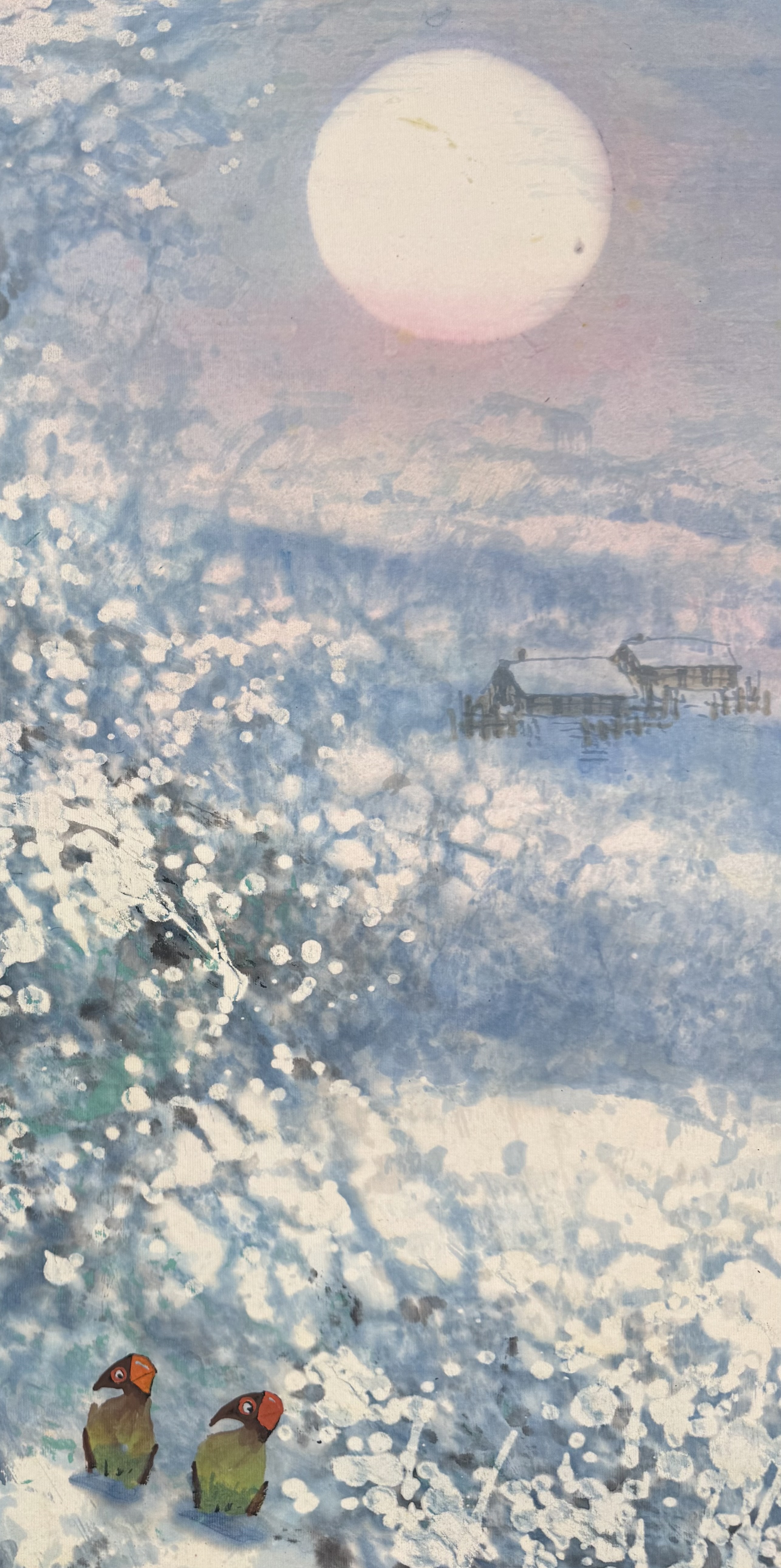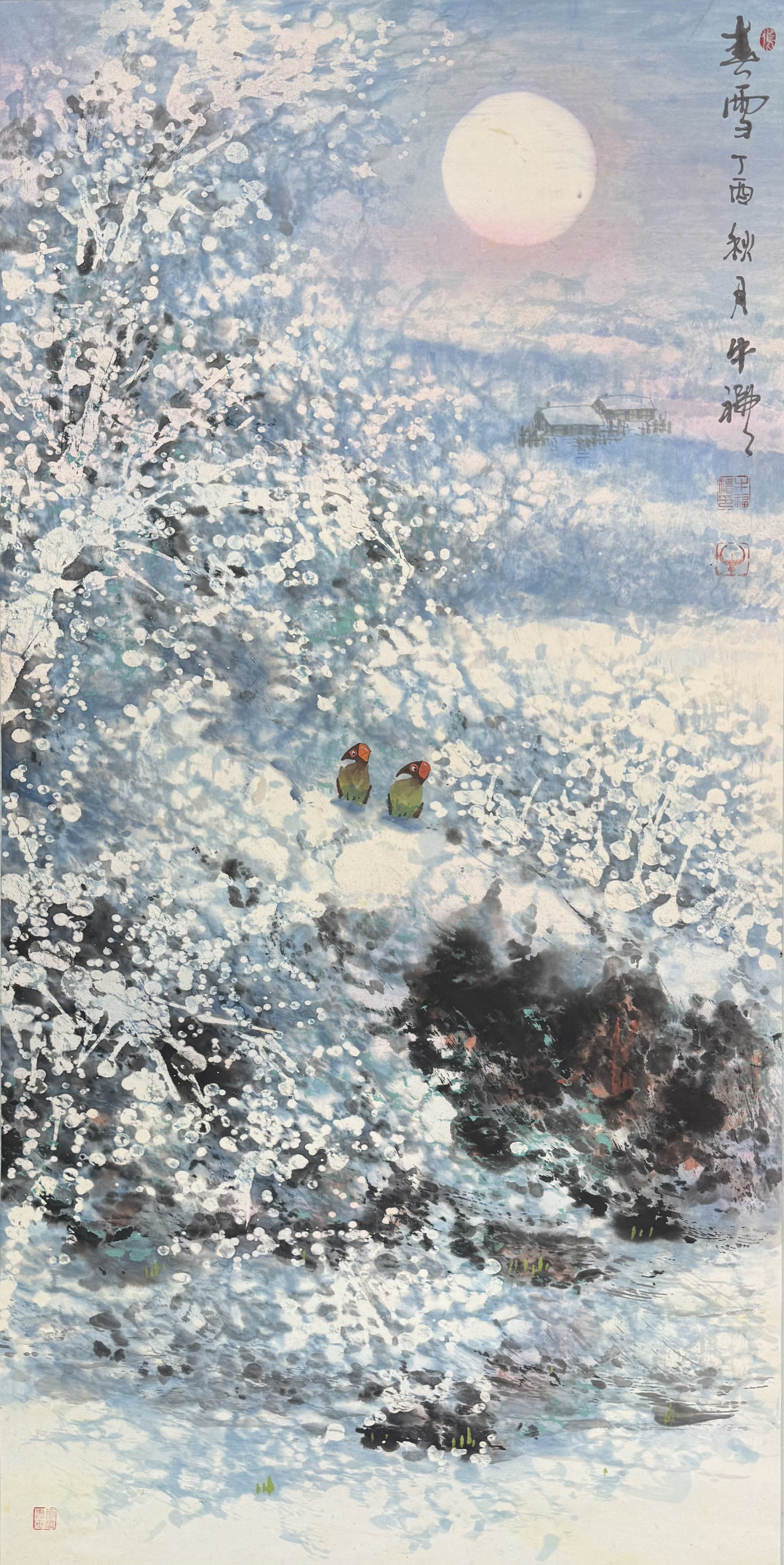全图采用立轴构图,远景是一轮清冷而圆润的明月映照着朦胧的村舍,中景与近景以泼墨泼彩手法描绘漫天飞雪与林木的层次。牛福礼巧妙运用留白与虚实变化,使画面充满呼吸感与空间感,银装素裹间流露出一种超脱尘世、空灵深邃的东方美学意境。