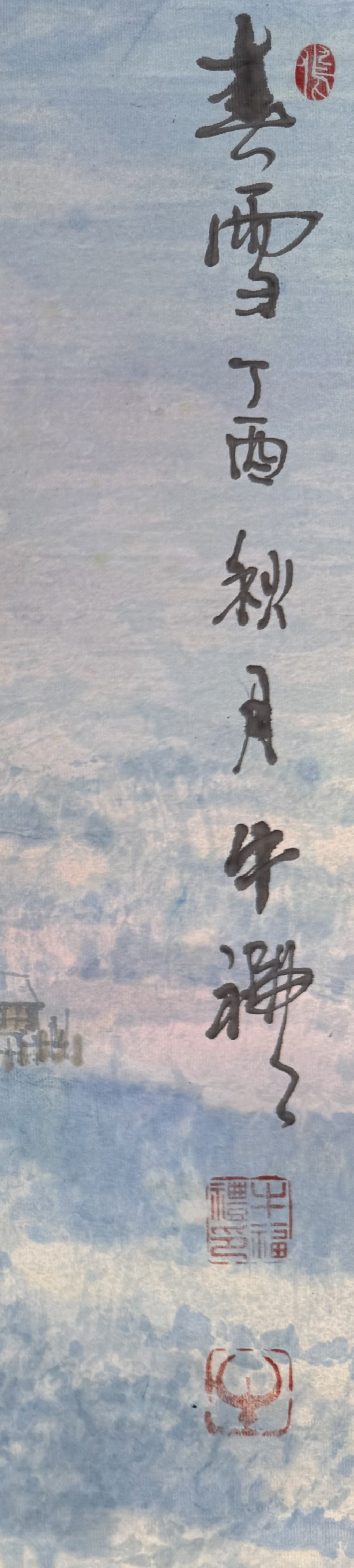 右上角题款行书自然洒脱,线条流畅而富有金石气。下方朱红印章错落有致,与墨色形成视觉呼应,既点明了创作的时间与背景,也在画面中起到平衡重心的作用。书与画的融合,让作品在视觉与文化层面上交织出深厚的文人气息与艺术格调。