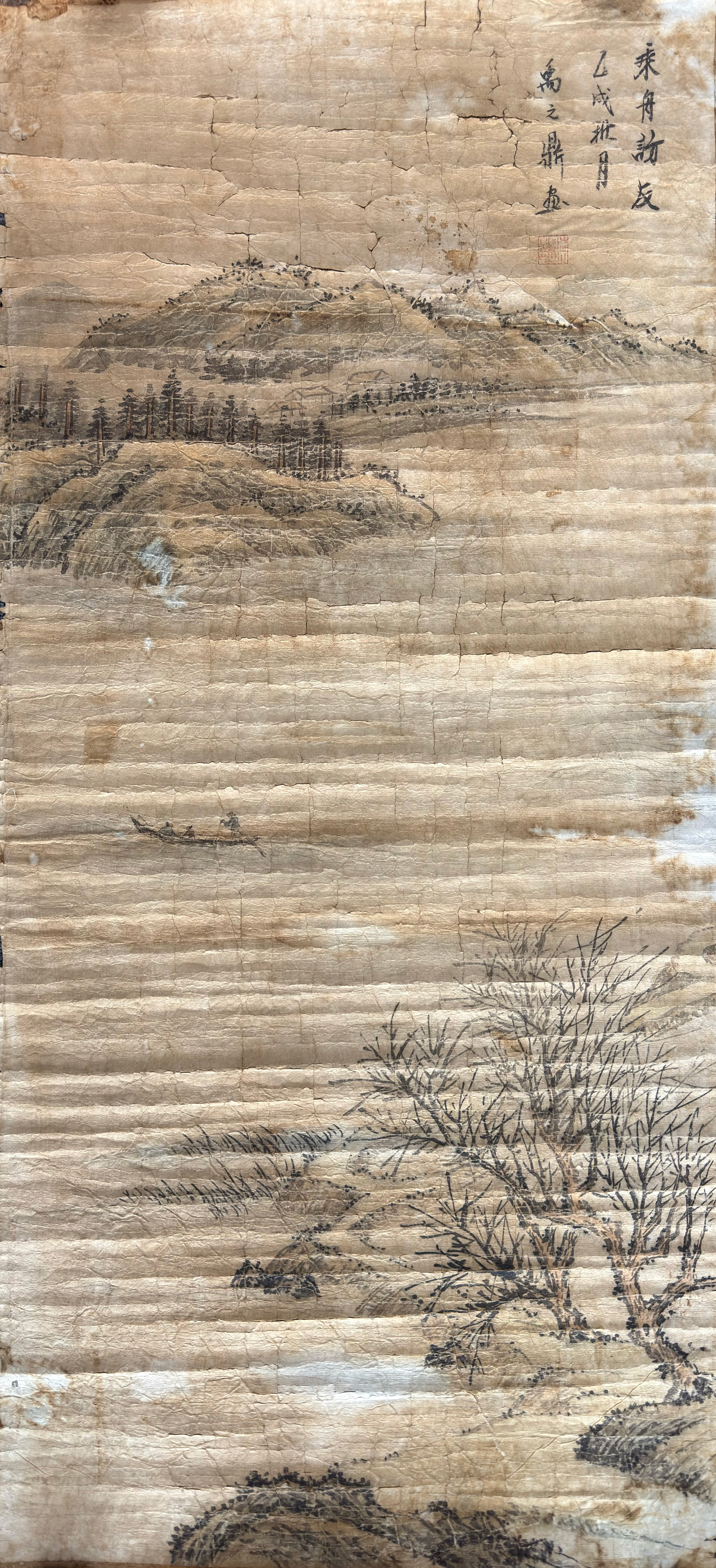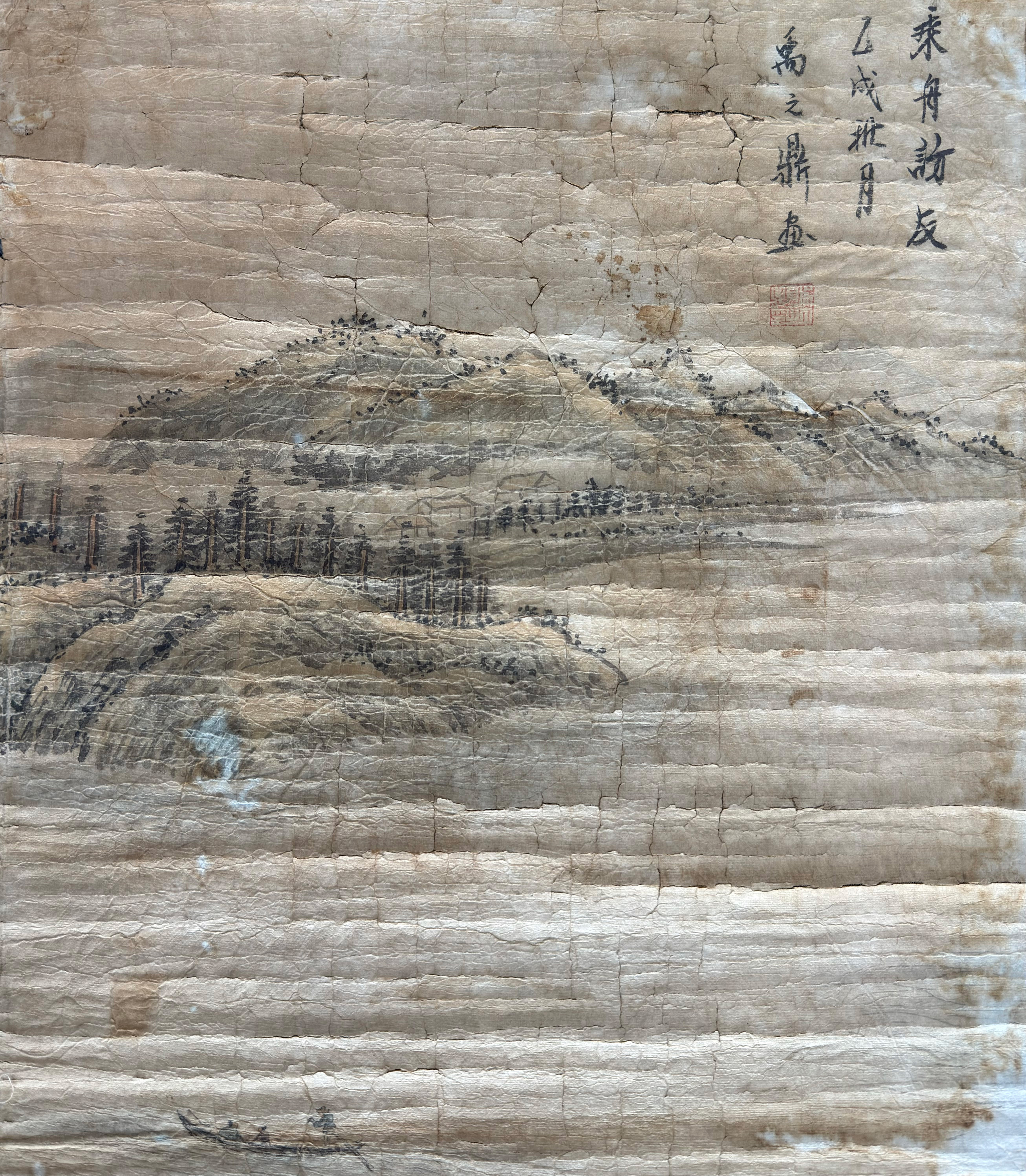 题款书“乘舟访友”,并落款“乙戌秋月 禹之鼎画”,钤朱文方印。款识与画意相互映衬,既点明主题,又增添了清雅文人的自题情趣。画面上方山峦重叠、松林苍翠,隐约可见村舍屋宇,流露出宁静悠远的隐逸气息。