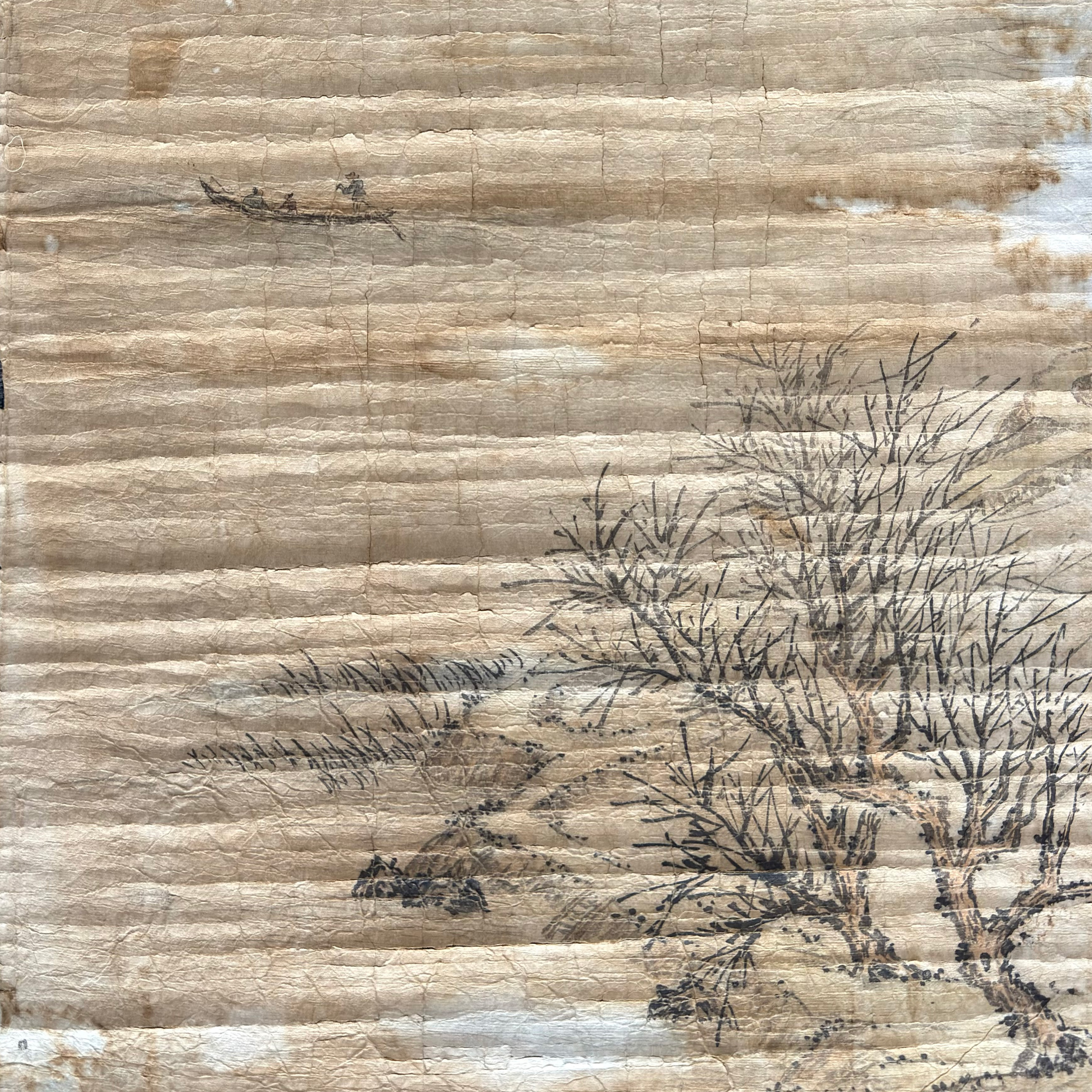 焦点为水面上一叶轻舟,文士端坐舱中,一人执橹徐行。禹之鼎以极简的线条勾勒舟与人,笔法流畅而不失气韵,展现出“访友”途中从容淡泊的心境。舟与水的虚实对照,使画面充满流动之美。