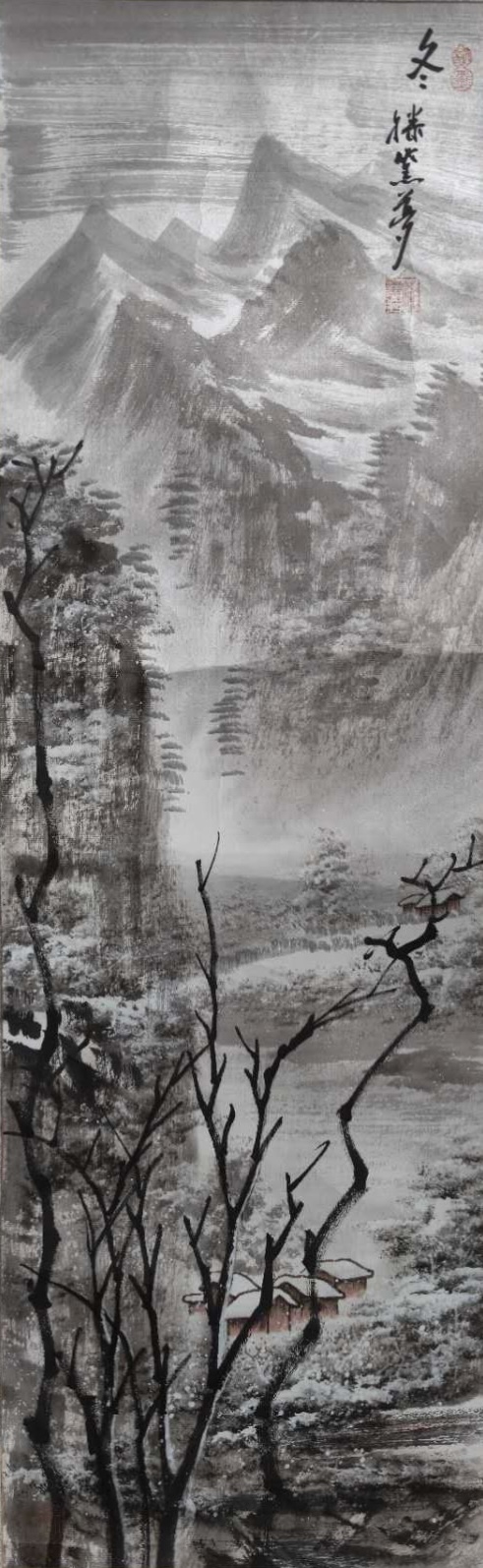 冬景以留白与浅墨为主,山川在雪色中呈现出空灵的层次。红顶小屋点缀其间,既打破了寒寂,又增添了温度。作品寓意瑞雪兆丰年,寄托着高洁、宁静的精神品格。