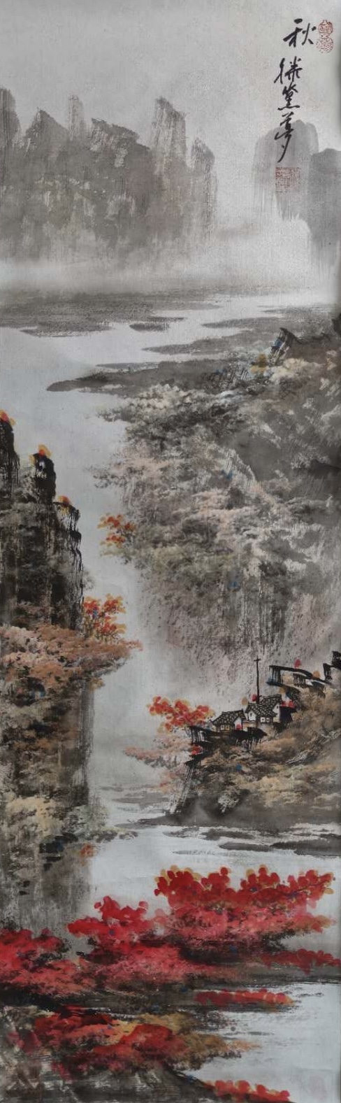 笔调转为温暖的橙红与金黄,漫山红叶层层叠叠,村舍依山而建。画家以丰收的意象与静谧的氛围描绘出秋日的富足与安宁,让观者感受到岁月的深沉与心境的沉静。