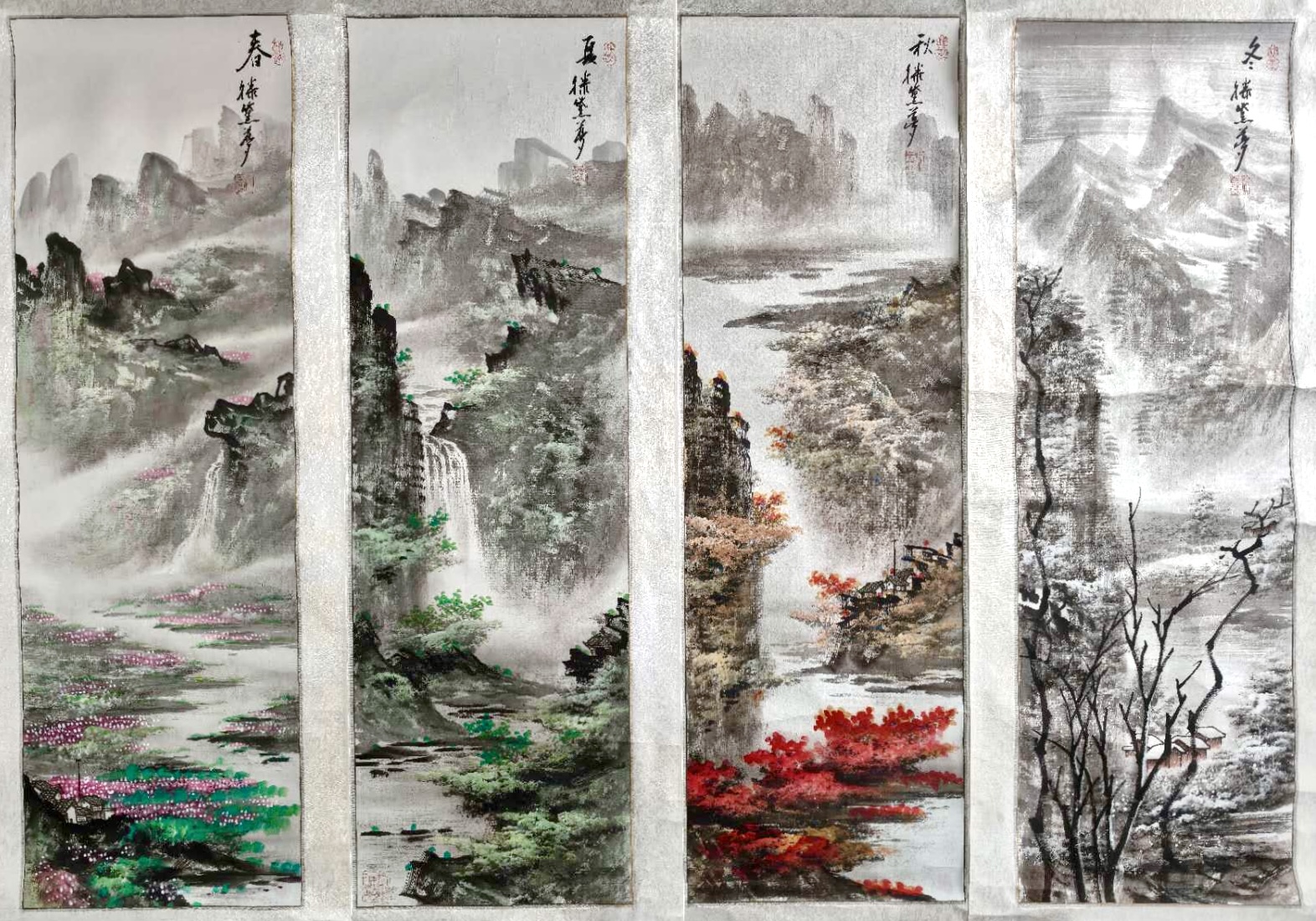 在四时更替的自然轮回中,天地的色彩与意象不断变化,孕育出无尽的诗意与美感。这组名为《四季富贵》的山水四条屏,由国家一级美术师滕士琪(艺名滕黛梦)倾情创作。作品以细腻的笔触与明快的设色描绘春、夏、秋、冬四季的气象之美,尺幅宏大(112.3cm × 35.5cm × 4),气韵一脉相承。整组画卷既承袭了传统山水的深远意境,又融合了当代艺术对生机与色彩的追求,寓意四季平安、富贵长流。