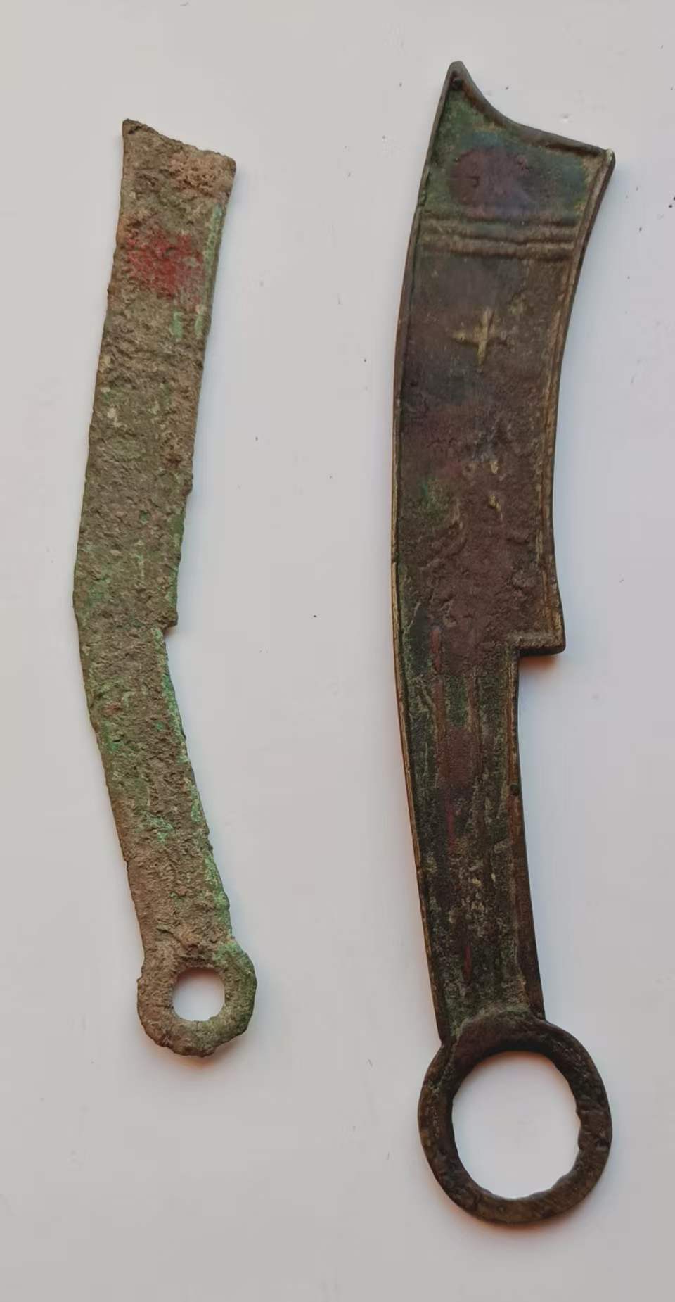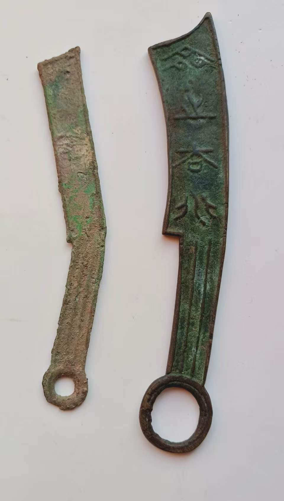 上方刀币背部平素无文,下方齐大刀背面则可见典型的三道横纹与标记。这种设计既是防伪特征,也是工匠在铸造过程中留下的识别符号,映照出战国时期货币工艺从实用走向规范的转变。