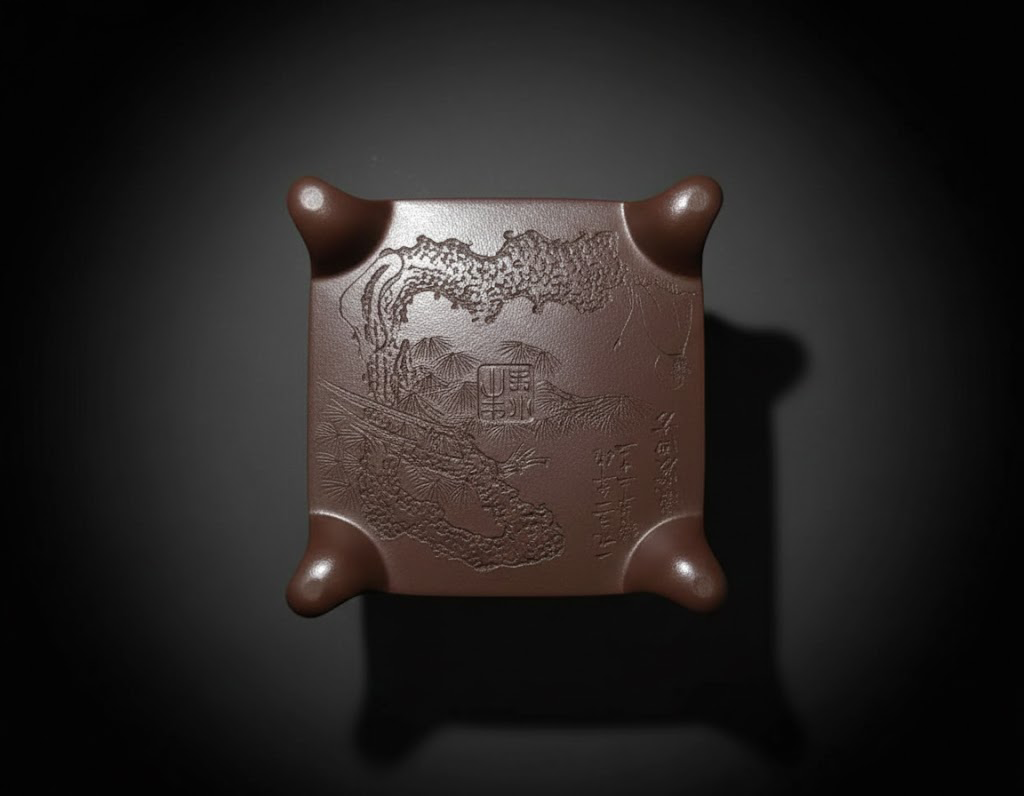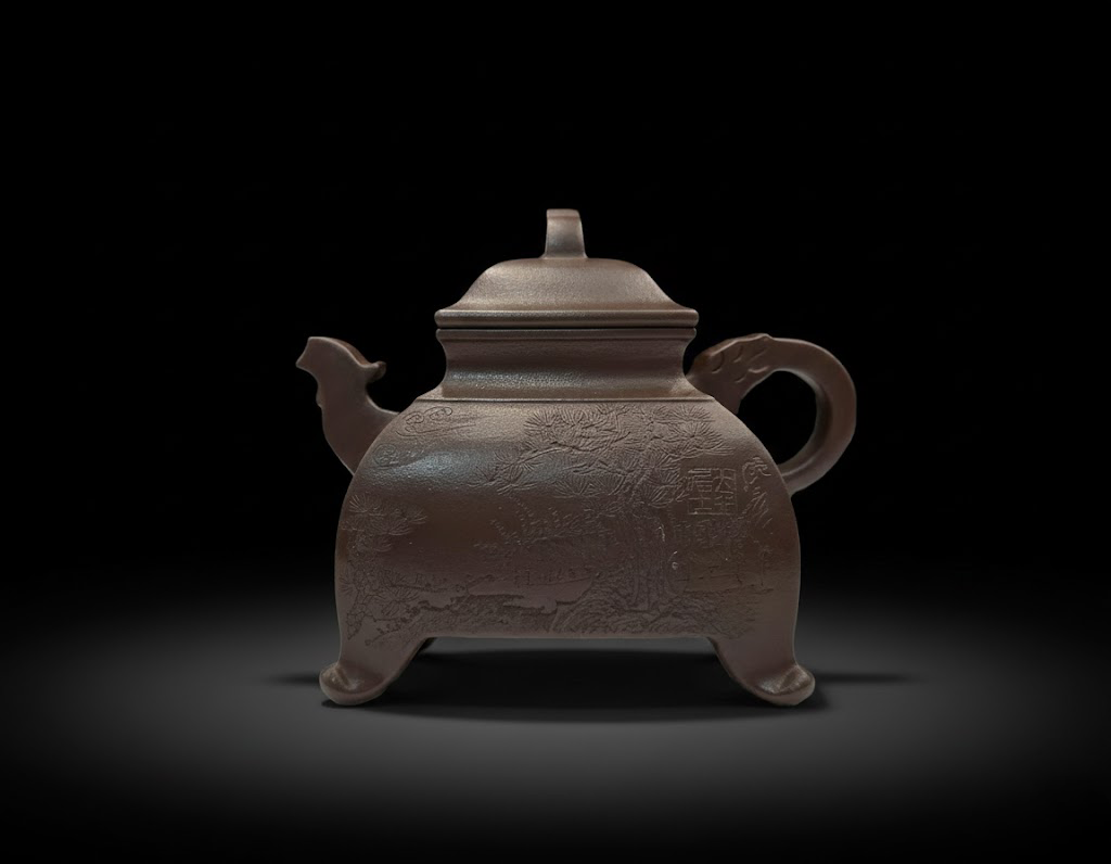 壶身由四根饱满的“钉足”支撑稳固,壶面以刀刻装饰苍松山石,笔意遒劲生动,赋予整器以松韵山骨的精神气象,使方器更添文人风骨。