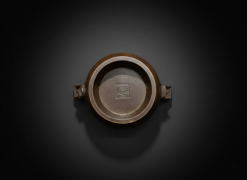 炉底中部铸有方框刻款“宣”,笔画遒劲,布局端整。这类私家刻款在文房清供中尤显讲究,不仅是制作者署记,也代表工艺与身份的象征。规整的圈足与厚重的铜质相映成趣,更显整器之精致。