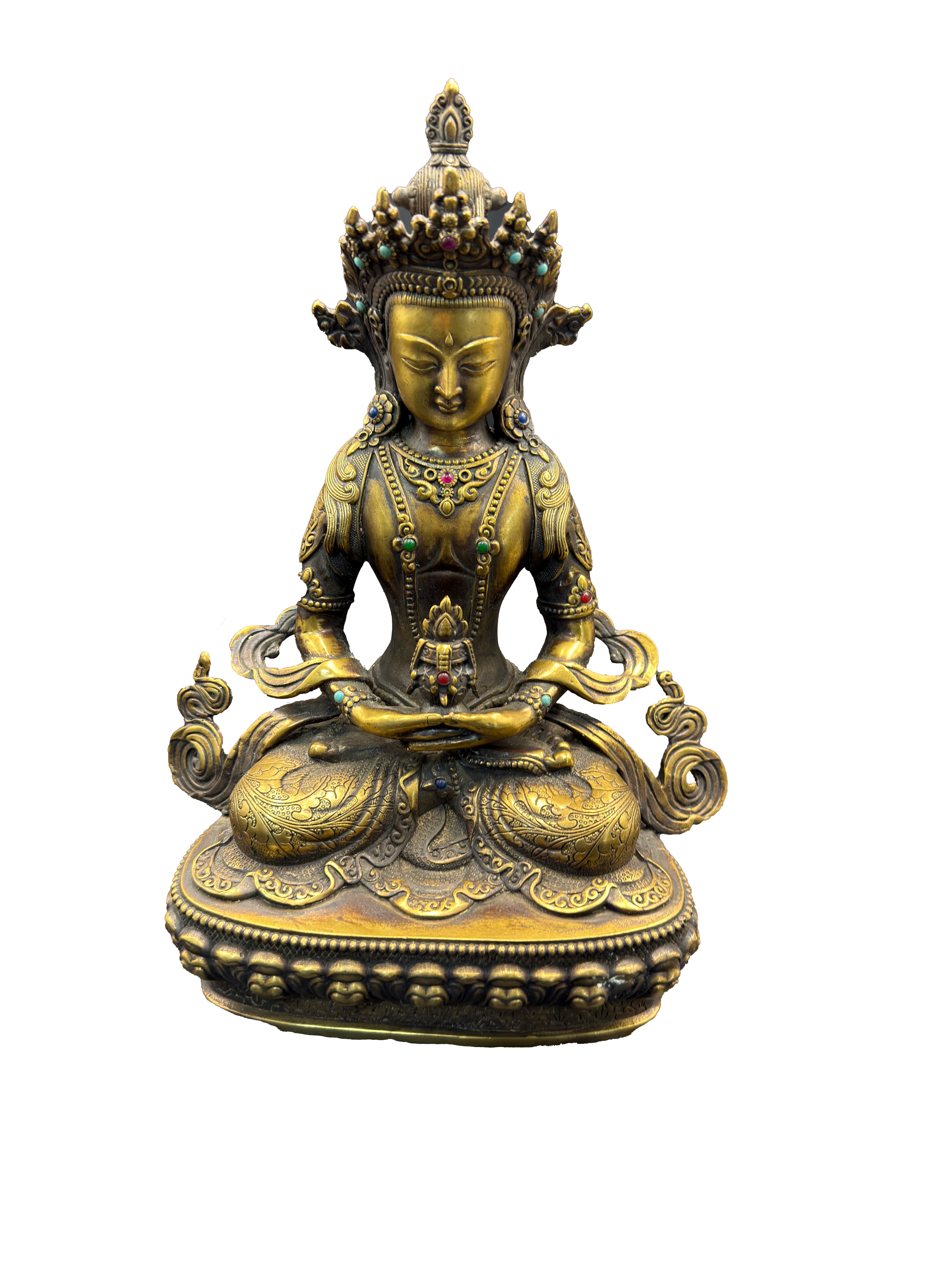 此尊佛像头戴精致的五叶宝冠,面相圆润丰盈,双手于腹前结禅定印托长寿宝瓶,周身饰以繁复的璎珞珠宝并嵌有彩石,充分体现了清代晚期造像追求华丽装饰与工整比例的艺术风格。