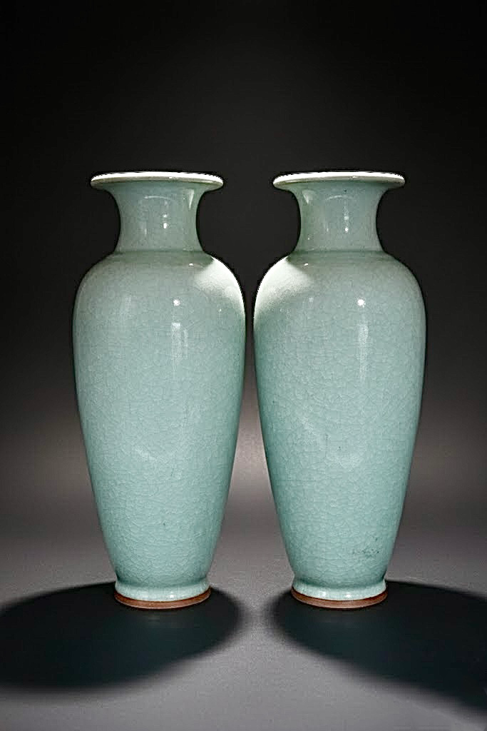 豆青釉开片观音瓶成对