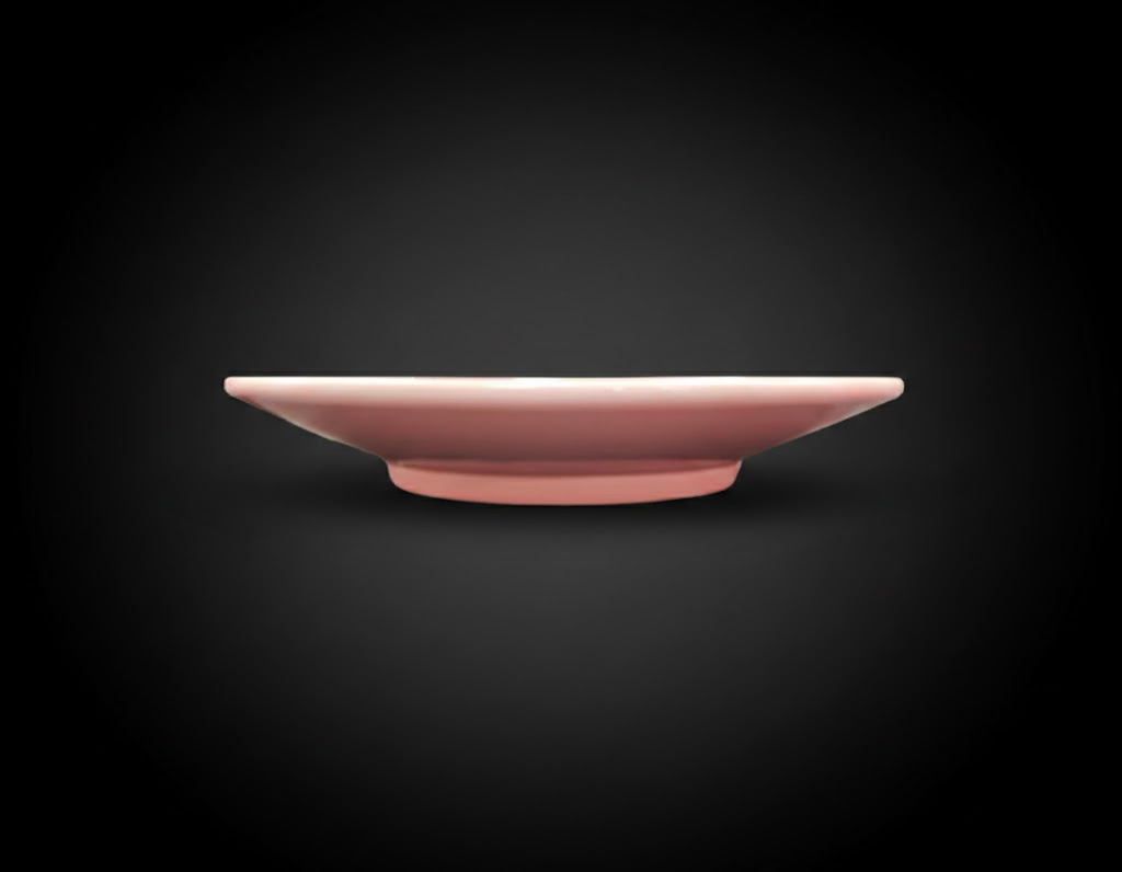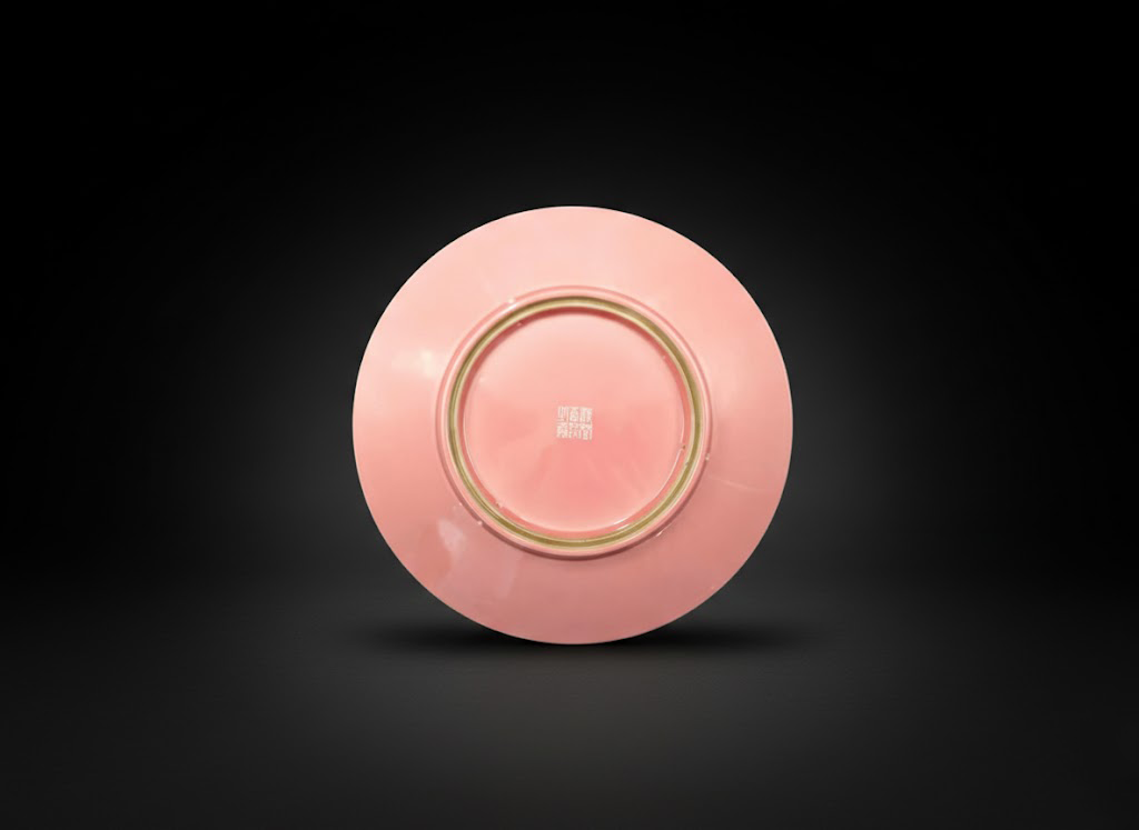 从侧面观之,该盘造型端庄稳重,比例匀称。其口径为27.5cm,高度为4.5cm,弧线柔和流畅,胎体厚薄一致。粉色釉层自盘心延展至盘沿,通体光泽柔润,釉质细腻如玉,透出温和雅致的气息,充分体现了王步在成型与釉料掌控上的非凡功力。
