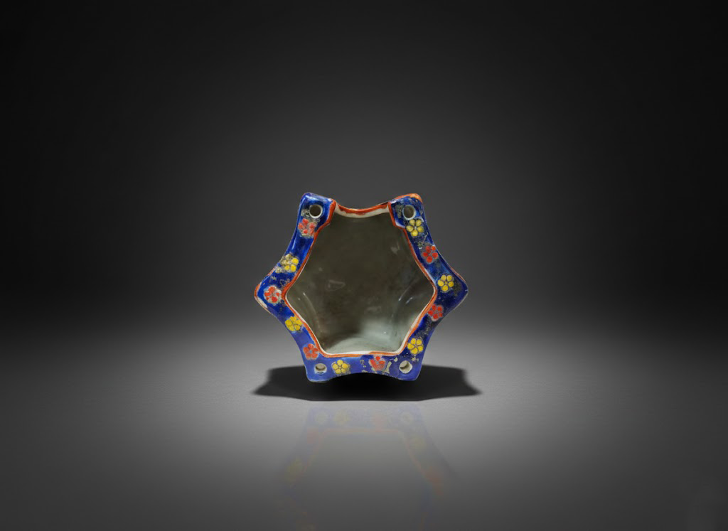 六角星形的口沿折角分明,布局严谨而富于变化。霁蓝釉为底,红黄相间的小花纹环绕其间,构成几何与繁缛装饰的巧妙结合,充满异域气息与视觉张力。