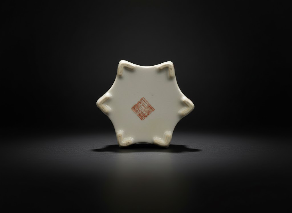 器底胎质洁白细腻,六角足端过渡自然,中央钤有红色篆书方框款识,显示其出自有一定规模的窑场。工艺细腻、款识清晰,反映出当时外销瓷在制作与品控上的高标准。
