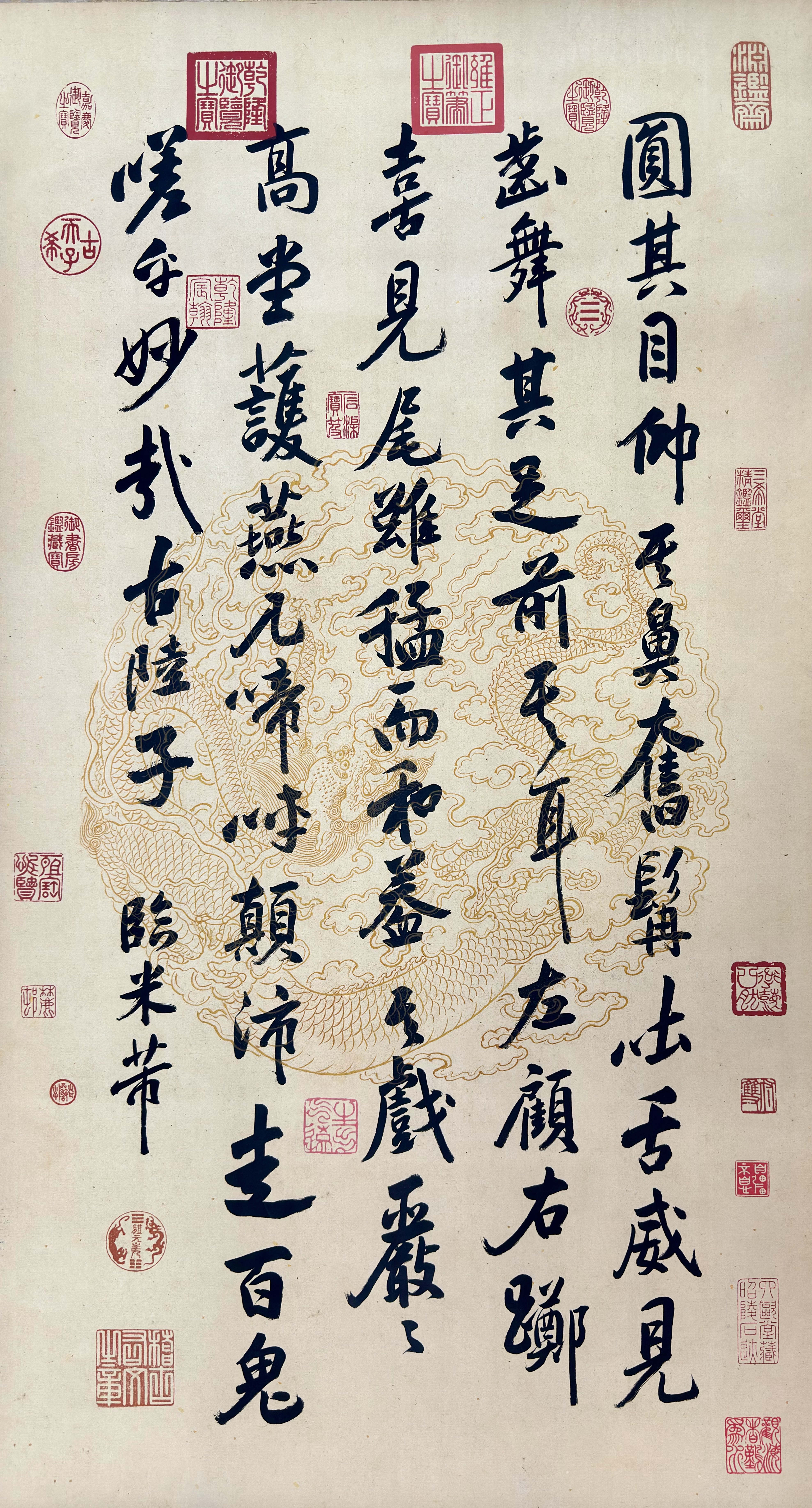 整幅全貌可见章法疏密得当,金龙纹底与劲墨行书交相辉映,钤盖“雍正御笔之宝”等清代御玺,足见此作在宫廷审美中的非凡地位;开篇部分“圆其目,仲其...”数字笔势稳健而带险峻,红印错落,气息庄重;正文细节处“喜见尾、虽猛而和”墨色枯润自然,与腾跃的龙纹暗合其势,书意与纹饰浑然一体,形成“文龙同舞”的独特视觉韵律。