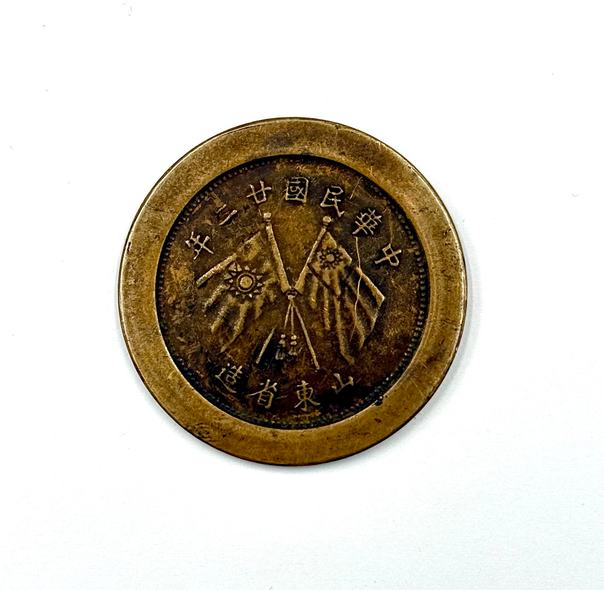 从正面看,钱币中央为象征民国的“双旗”图案——交叉的五色旗与青天白日旗庄重矗立,象征团结与新生。旗面上方环刻“中华民国廿二年”纪年字样,下方标有“山东省造”,准确指明了铸造时间与产地,展现出当时山东地方铸币机构的制币工艺水准。