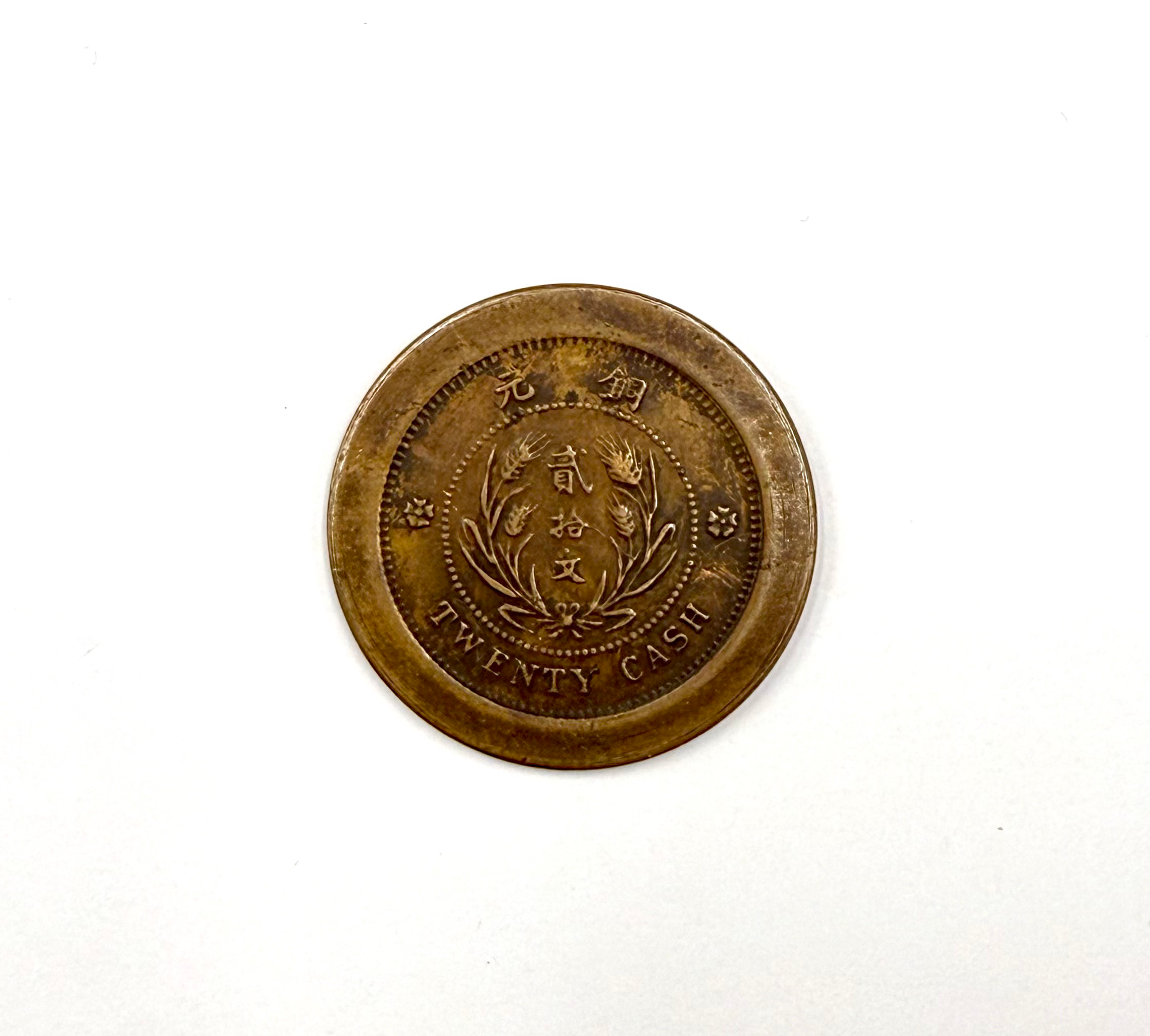 背面则以嘉禾纹为主题,麦穗丰满挺拔,象征丰收与繁荣。中央铸有“贰拾文”面值字样,上方书“铜元”,下方刻有英文“TWENTY CASH”。这种中西合璧的币面设计,是清末民初过渡时期的典型特征,也映射出当时社会在制度与审美层面的多元交融。