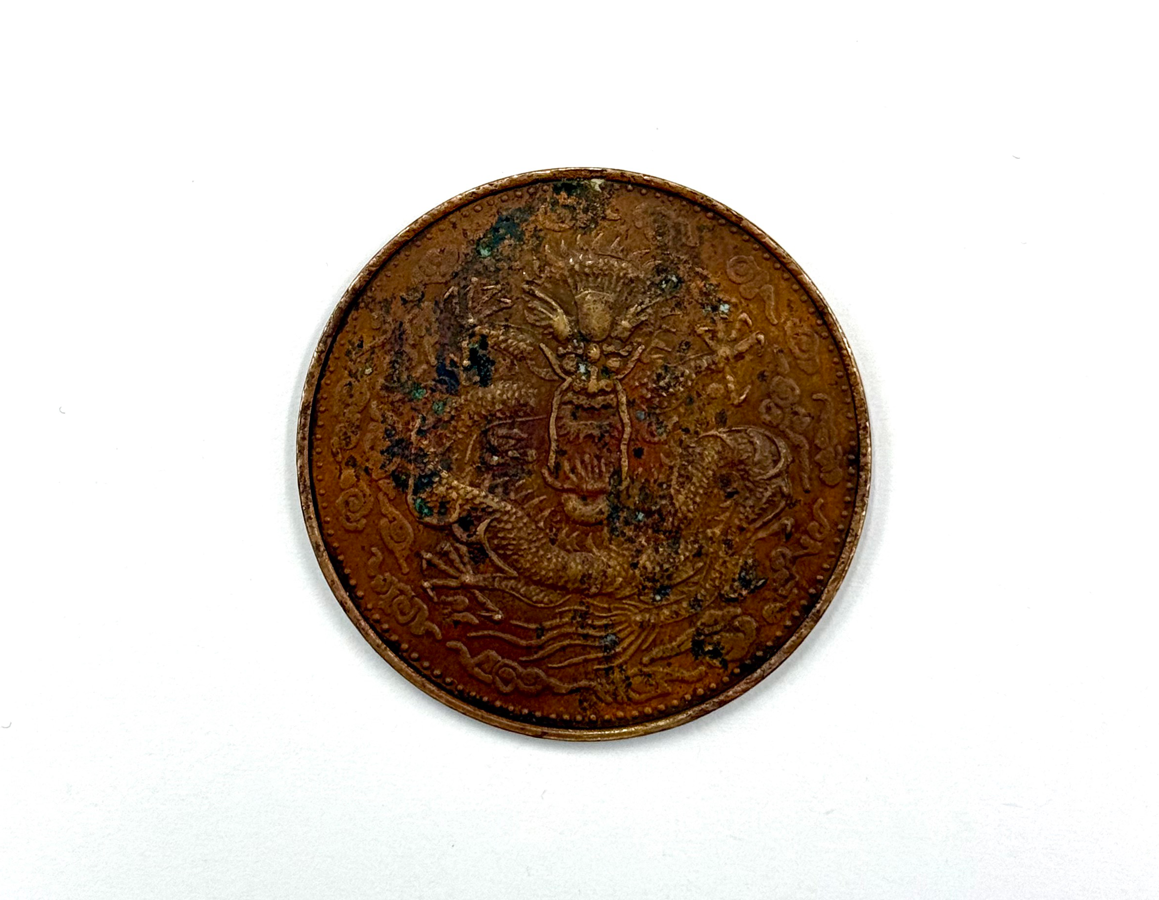背面为清代典型的“坐龙”纹样。巨龙昂首怒目,爪握祥云,身躯盘绕,气势雄浑。环绕的云纹线条流畅自然,既传达出皇家象征的威严,又呈现出晚清造币浮雕艺术的高超水准。历经岁月磨蚀后,龙纹间的包浆更显古朴沉稳,尽显百年风华。