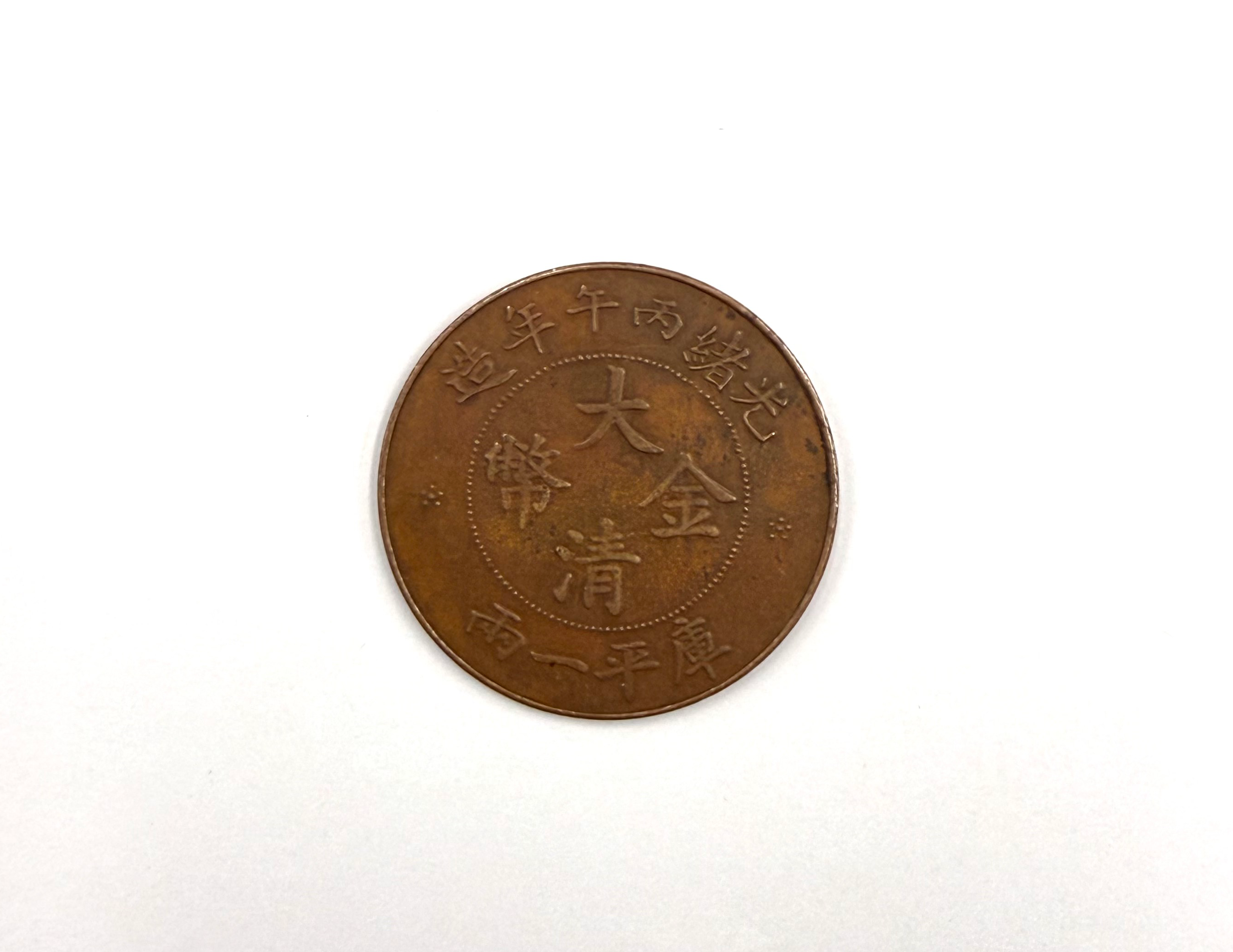 光绪丙午年大清金币是清末币制改革的重要产物。光绪三十二年(1906年),清政府在西方金本位思想影响下,尝试以金币取代银币,以建立统一币制。天津造币总厂遂奉旨试铸“丙午年大清金币”。然而,由于当时国库黄金储备有限,加之新币制度未能全面推行,金币未正式发行,流传于世者多为后期以原模翻铸的铜质样币。此枚铜样币重20.20克,正是晚清货币制度转型的重要实物见证。