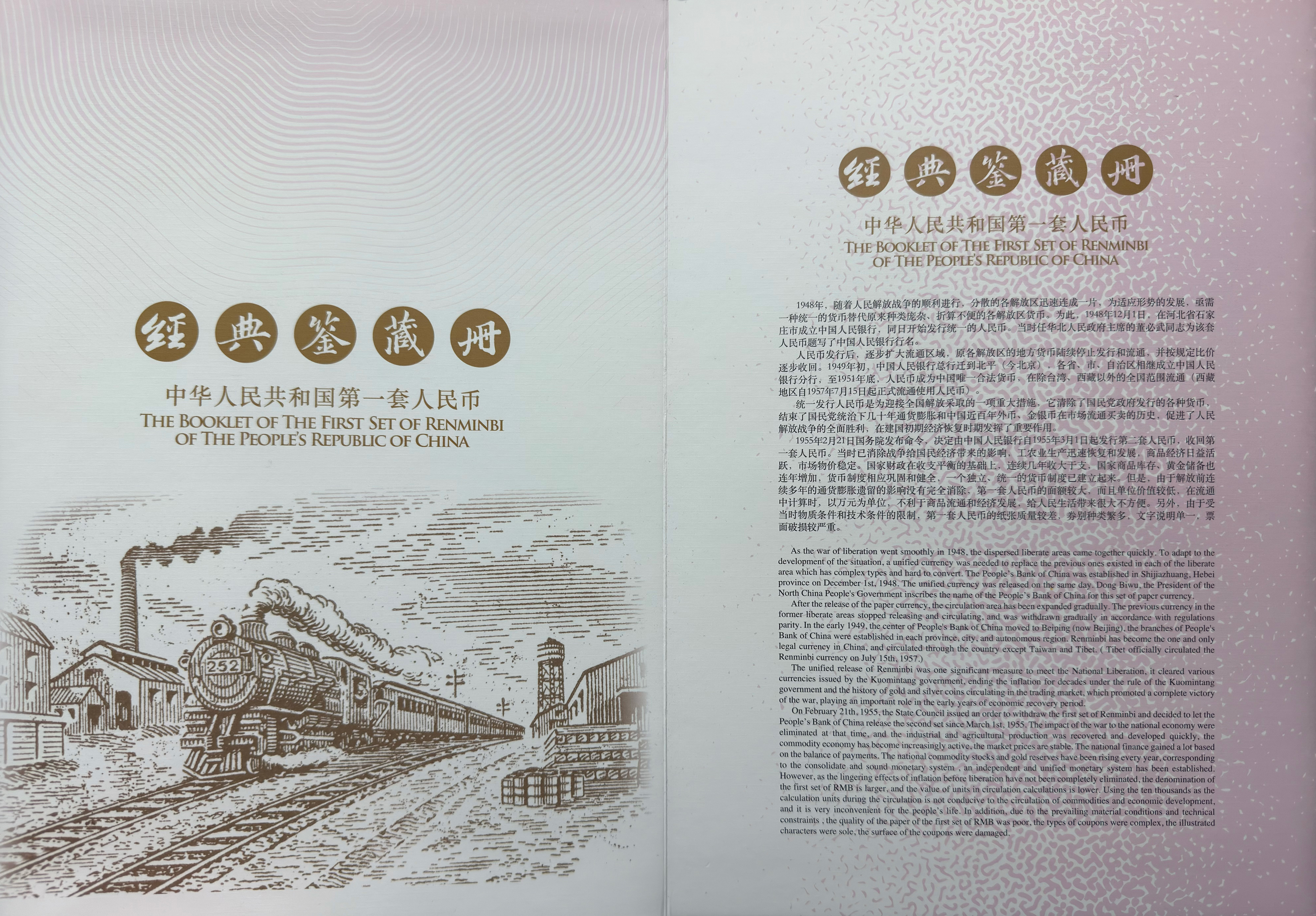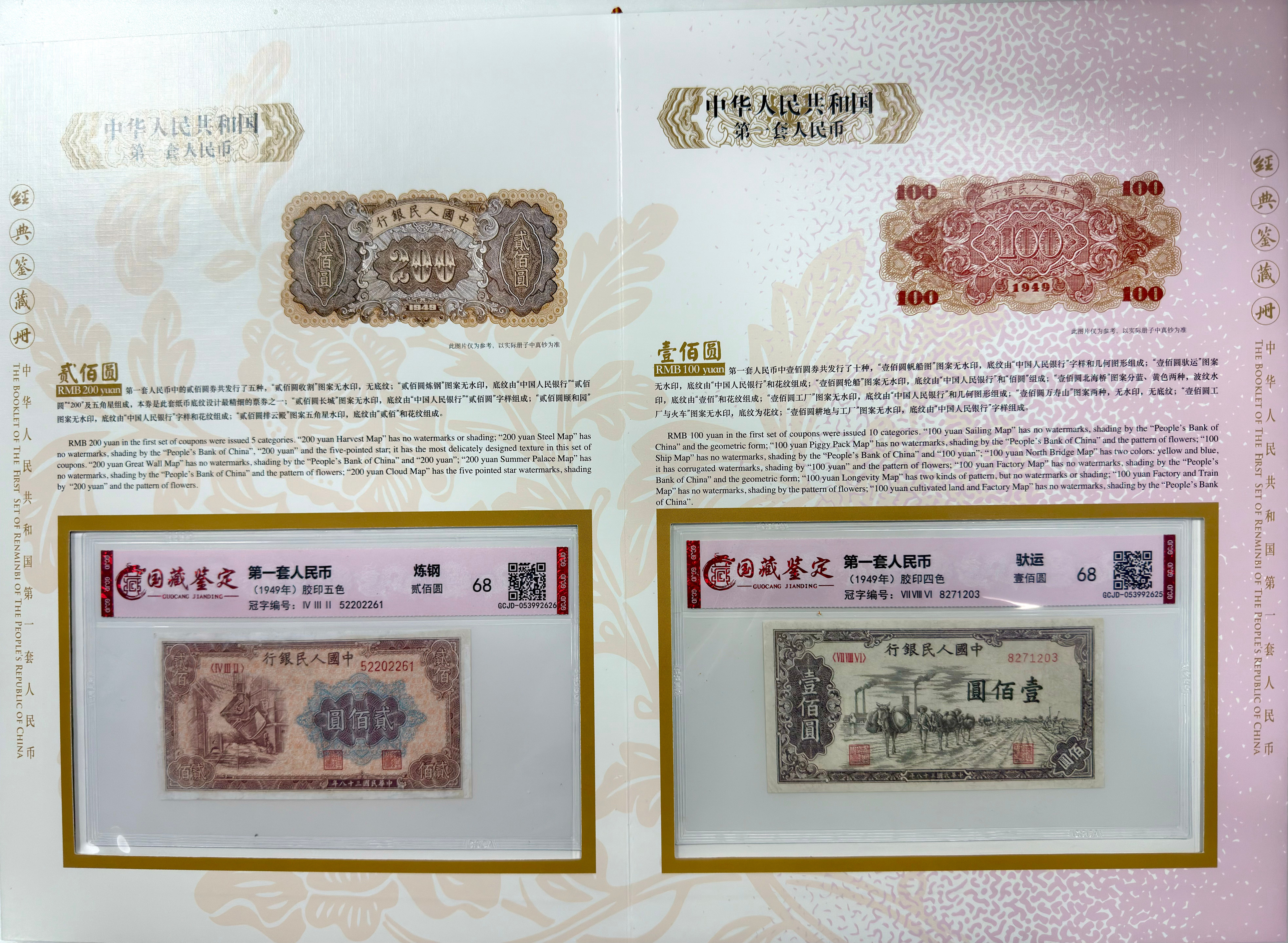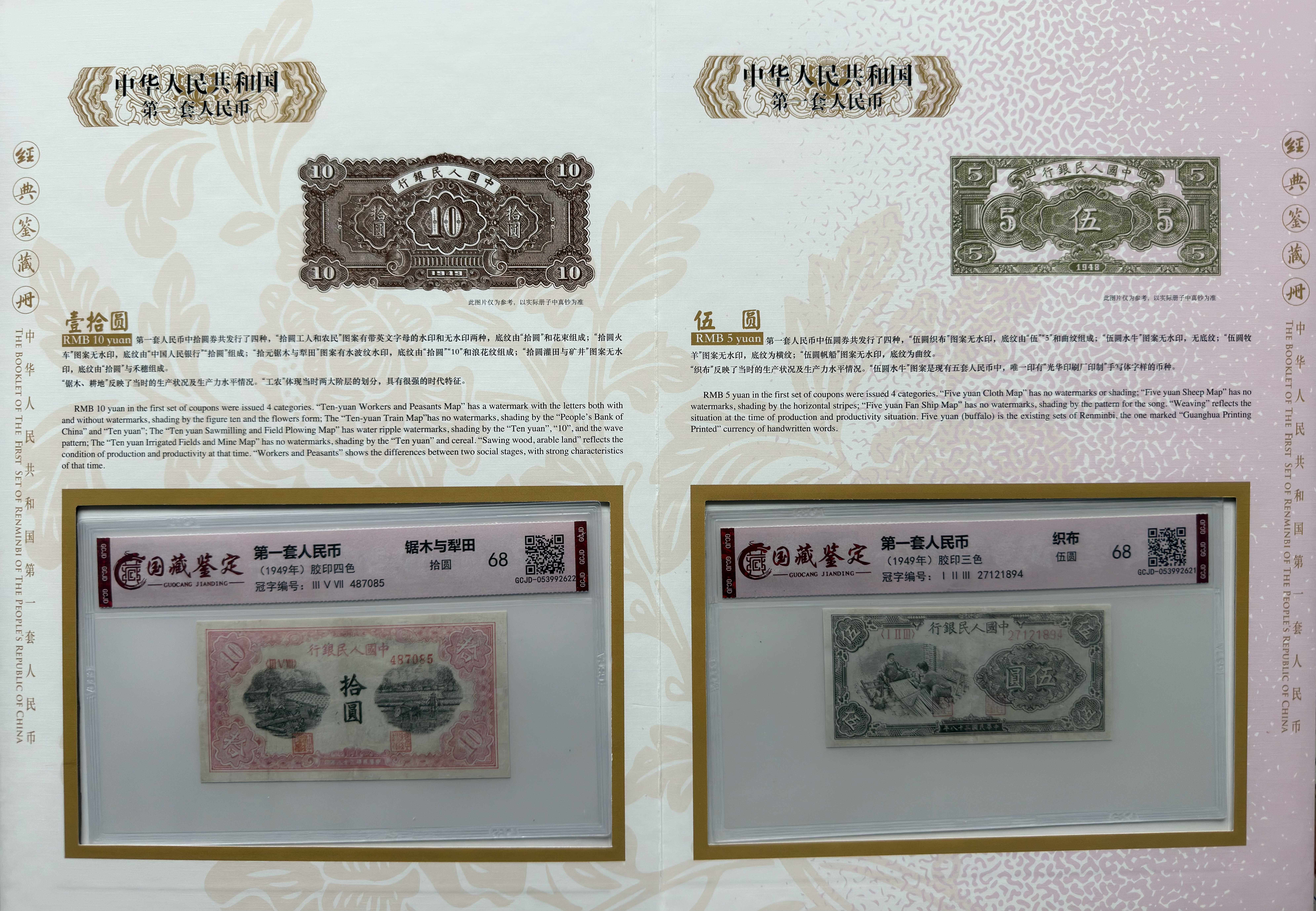 《中华人民共和国第一套人民币·经典鉴藏册》为一套系统整理的精装收藏册,收录 11枚经专业评级机构鉴定封装的第一套人民币代表性纸币。第一套人民币自 1948年12月1日 正式发行,是新中国建立货币体系的重要起点,在统一解放区货币、稳定金融秩序以及恢复国民经济方面发挥了关键作用。其设计题材广泛,既有农业生产、工业建设,也有交通运输与社会生活场景,形成了一幅浓缩的新中国早期社会图景。如今,这些纸币不仅是货币史的重要实物资料,也成为纸币收藏领域极具代表性的历史见证。