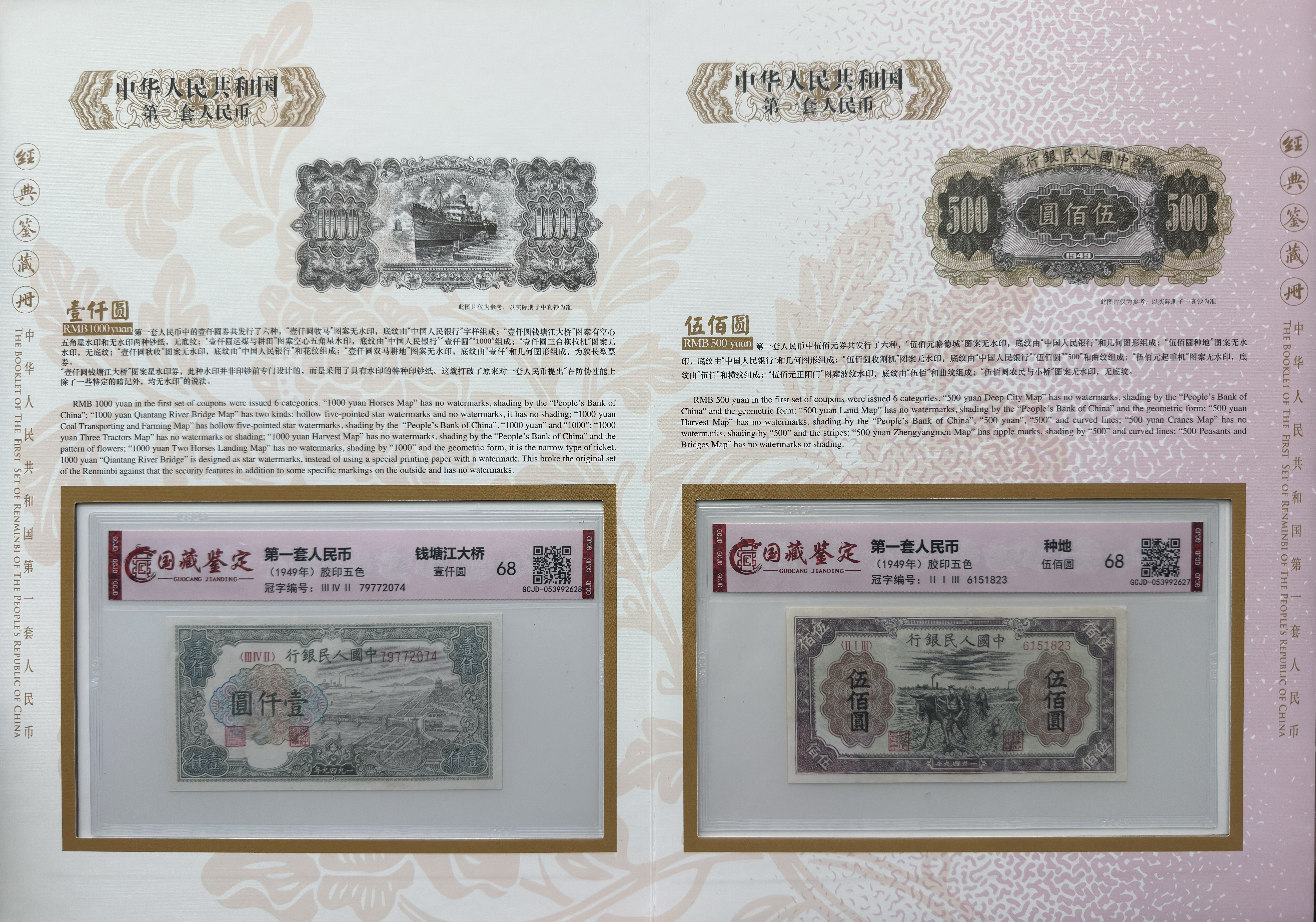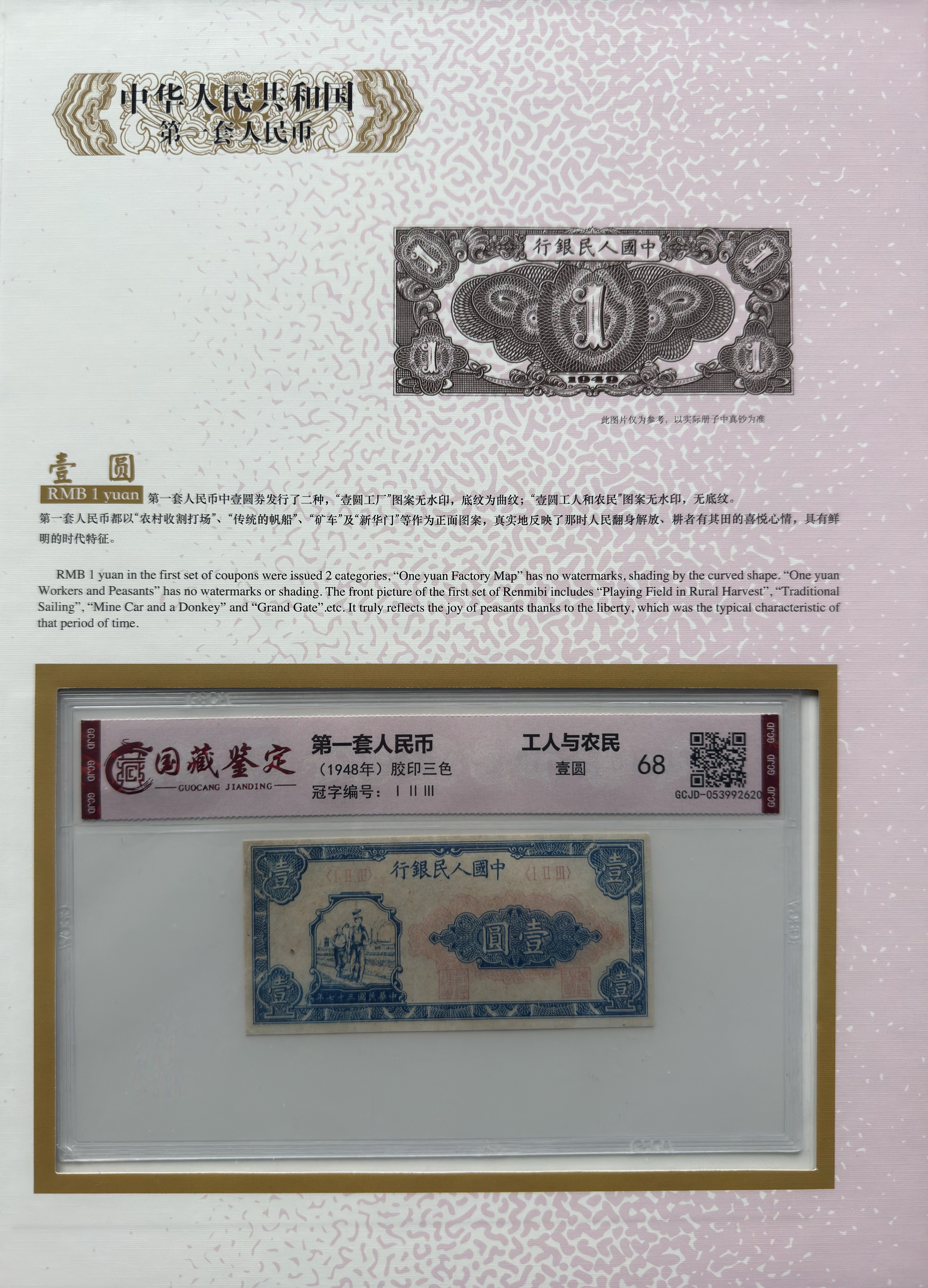 这套经典鉴藏册通过专业评级封装的方式,将第一套人民币中的多枚代表性纸币集中展示,使其既具系统性,也便于长期保存与研究。整套纸币从农业、工业到交通与城市建设,构成了一幅反映新中国早期社会发展的历史长卷。作为货币史的重要实物,这些纸币不仅记录了时代的经济与社会面貌,也承载着中国金融体系起步阶段的珍贵记忆。