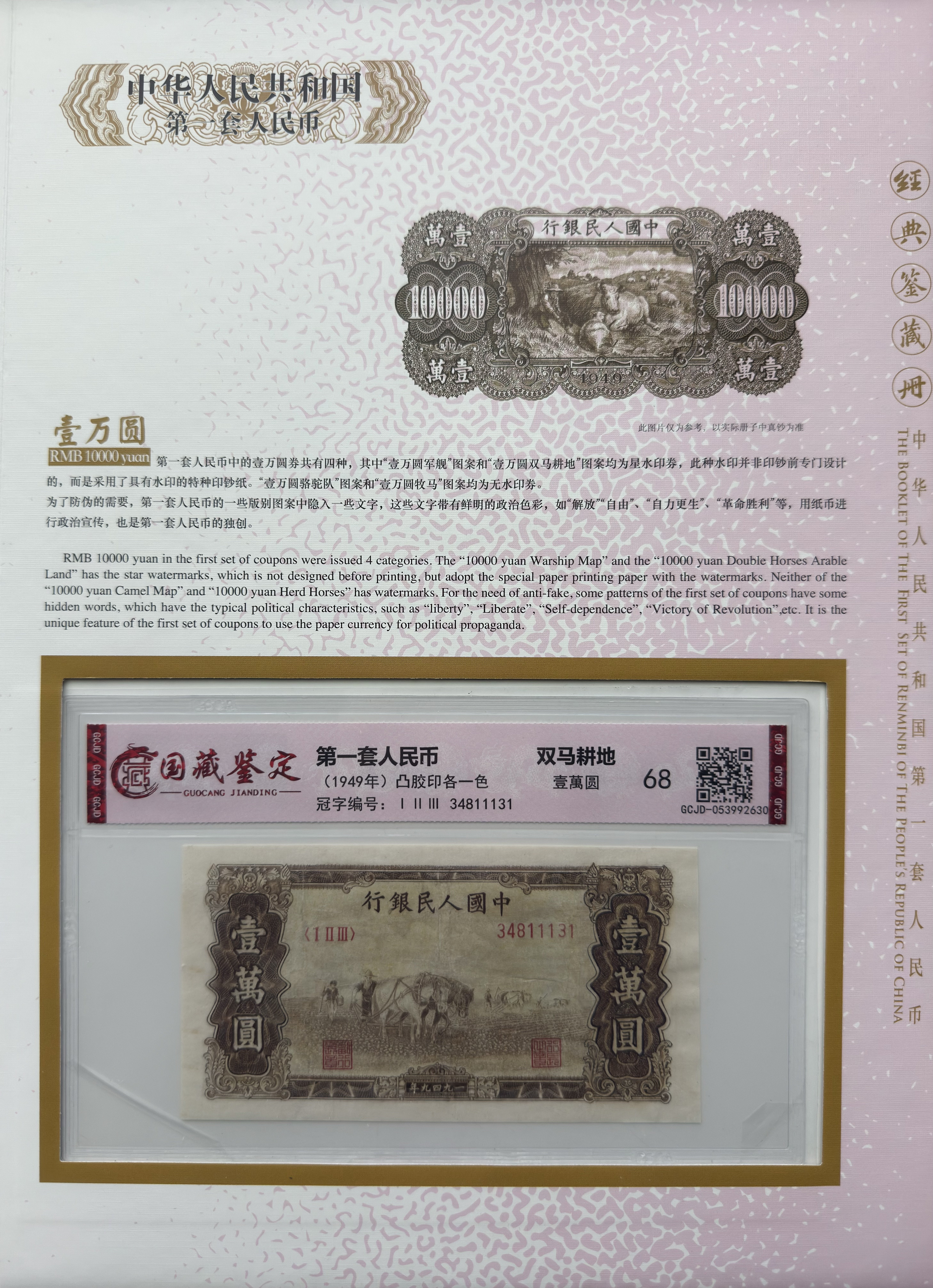册中收录的 壹万圆“双马耕地” 纸币,画面以农田劳作场景为主体,双马并耕的形象生动体现了农业生产的繁忙景象。