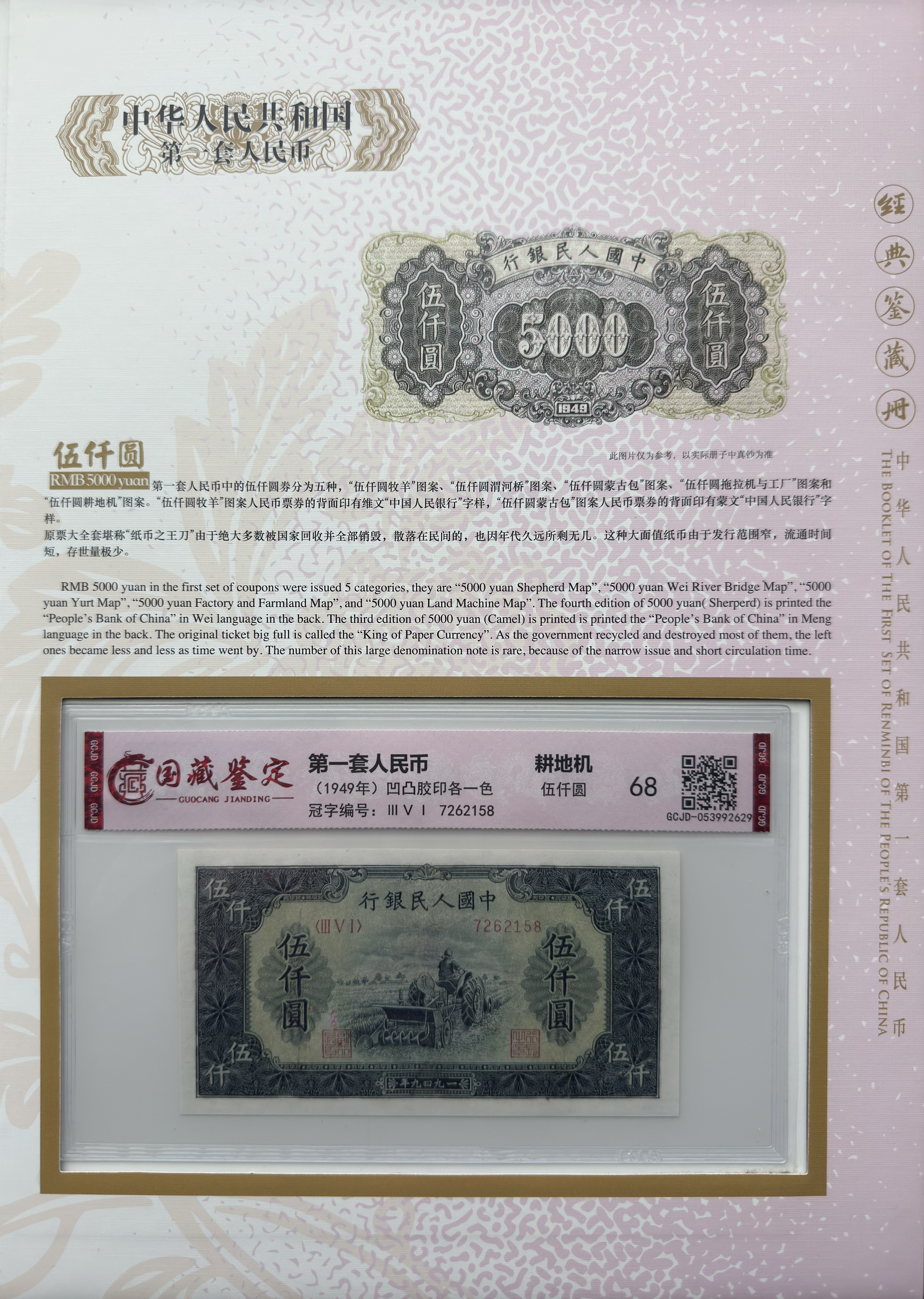 另一枚 伍仟圆“耕地机” 则记录了农业机械化刚刚萌芽的时代图景,拖拉机在田间作业的画面象征着农业生产方式逐步迈向现代化。