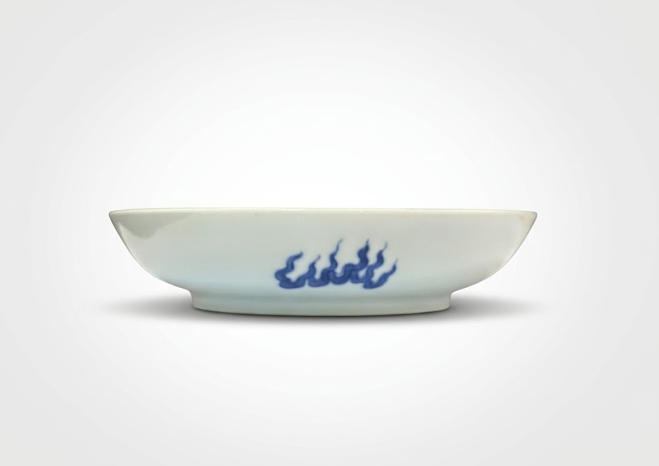 盘心以青花绘就龙、凤、麒麟、虎、龟五种瑞兽,合称“五灵”。其中龙象征权威与祥瑞,凤寓意高贵与太平,麒麟代表仁德与昌盛,虎主威严与镇守,龟则寓意长寿与稳固。五灵齐聚,不仅体现了传统宇宙观中的和谐秩序,也寄托了对国泰民安、福寿绵长的美好期许。