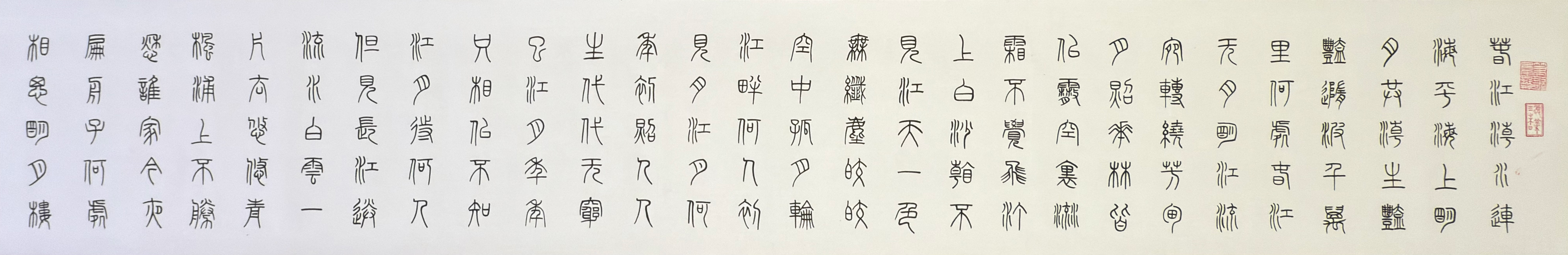 完整篆书长卷展现出稳定而宏大的结构体系,结字严整,行列有序。钤印分布得当,在平衡画面的同时增强层次变化,使整件作品在形式与内容之间达到和谐统一。