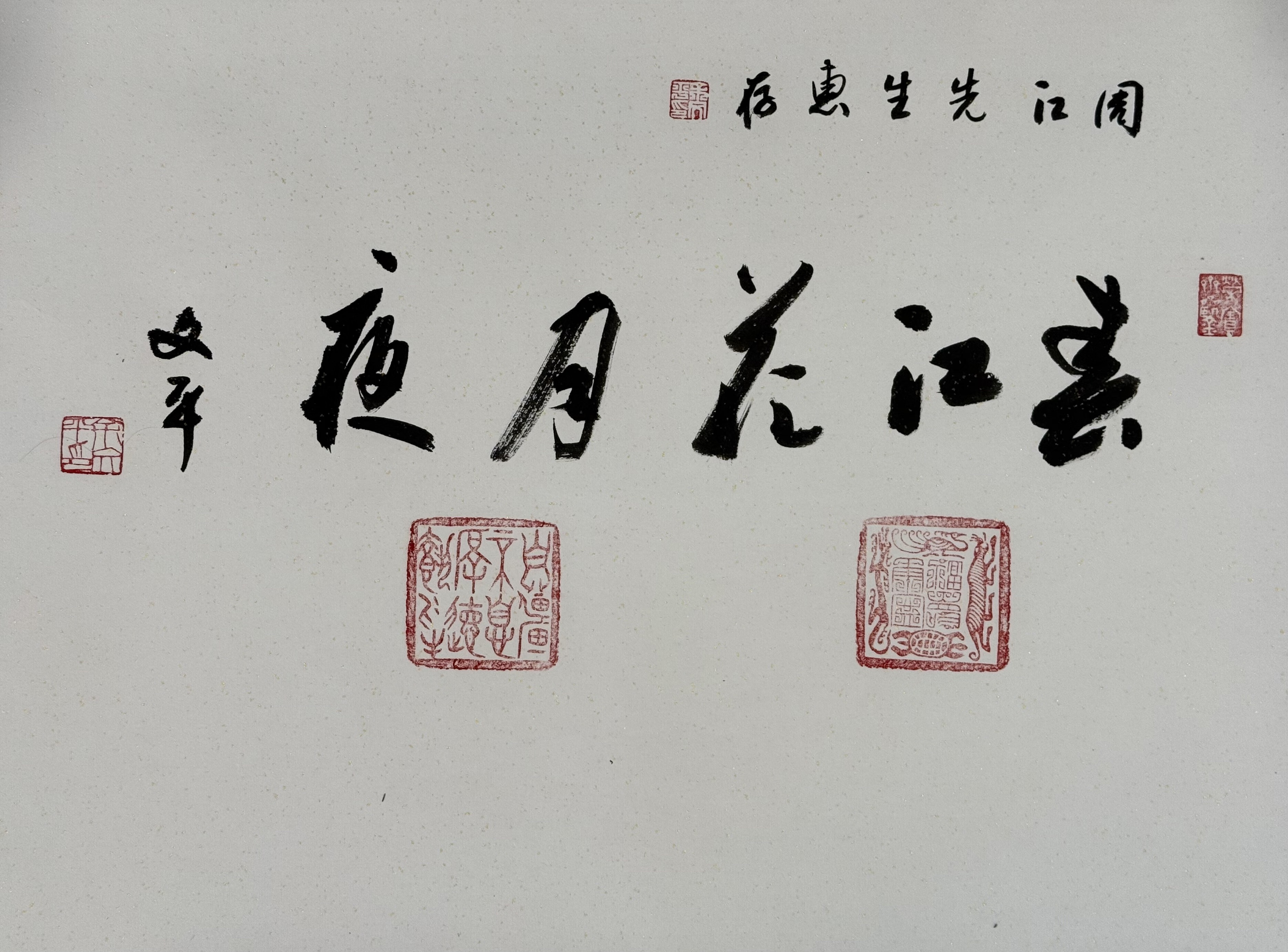 以行草书写就“春江花月夜”标题,笔势连绵,提按分明。墨色在浓淡枯润之间自然流转,既表现出江水的流动感,又传递出月夜的静谧氛围,形成动静相生的艺术张力。