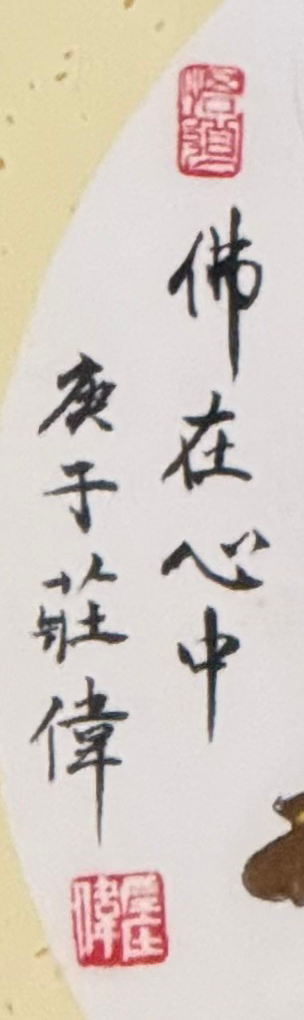 画面左侧题写“佛在心中”,以行书入画,笔意自然流转,不事雕琢却意味深长。这一语句直指禅宗核心理念“即心是佛”,强调觉悟不在外求,而在自心体认。落款“庚子庄伟”点明创作时间,结合上下朱文印章,使整幅作品在文人画传统的规范之中,又显出从容与洒脱。书法与绘画在此相互映照,使画面不止于视觉表达,更具思想厚度。
