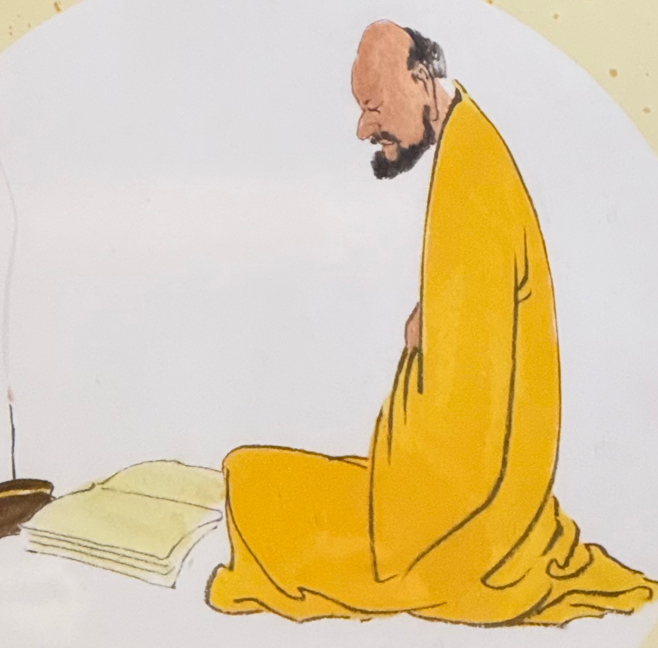 画面主体为一位席地而坐的修行者,身披明黄僧袍,低首垂目,专注于案前经卷。人物面容清癯而安详,线条简练却富有张力,衣纹的处理既见厚重,又不失流动之感。画家并未刻意强化细节,而是通过姿态与神情传达内在状态,使观者在无声中体会到一种“观经悟道”的沉静氛围。这种处理方式,正体现了中国画“以形写神”的审美传统。
