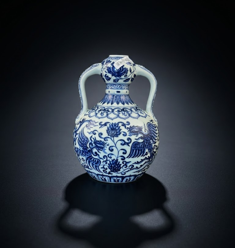 此件青花如意耳葫芦尊,以挺拔秀雅之姿展现出明代宣德时期瓷器艺术的成熟风范。器形取葫芦之态,上小下大,比例协调,线条圆润流畅,既富变化又不失端庄。胎质细腻坚致,釉面莹润通透,青花发色沉稳而富层次,整体气韵清朗高雅,体现出宣德时期制瓷工艺的精湛与审美的高度统一。