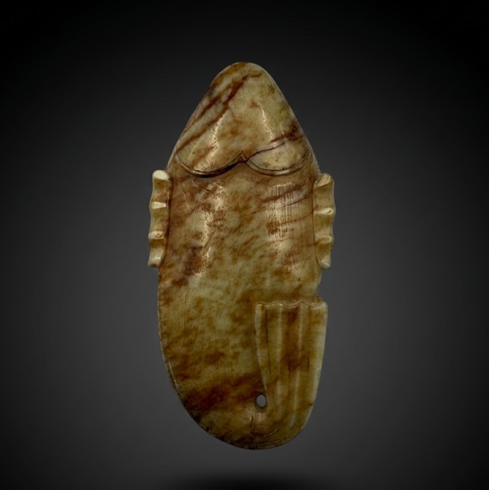 鱼身背部以圆雕手法顺势而成,线条圆润流畅。受天然色沁影响,局部呈现出红褐色斑块,层次丰富而不显杂乱,反而增强了整体的古朴韵味。尾部向一侧卷曲,并巧妙开设系孔,使器物在静态之中蕴含动势,同时兼具佩挂与把玩的实用功能,体现出明代工匠对形式与功能统一的精准把握。