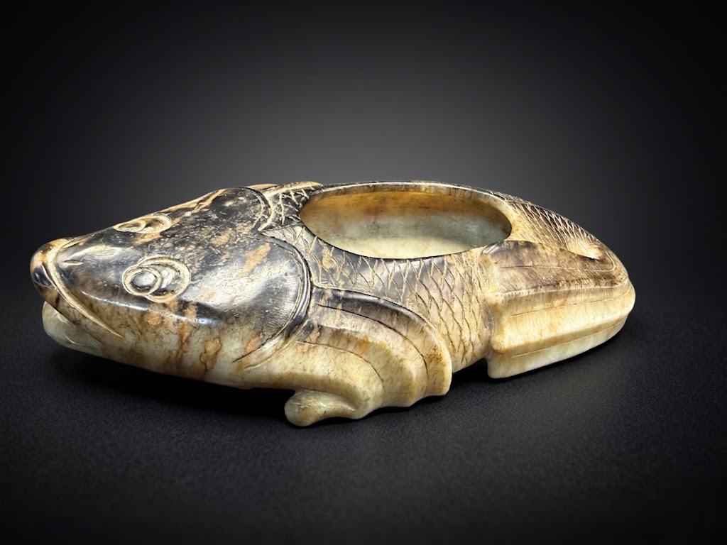 从侧前方观之,鱼头饱满微昂,口部开阔,腮部线条圆润自然,整体姿态仿佛游弋水中、轻启呼吸。雕刻者通过对比例与曲线的细致控制,使器物在有限体量中呈现出极强的空间感与生命力,既不失写意之趣,又具写实之骨。