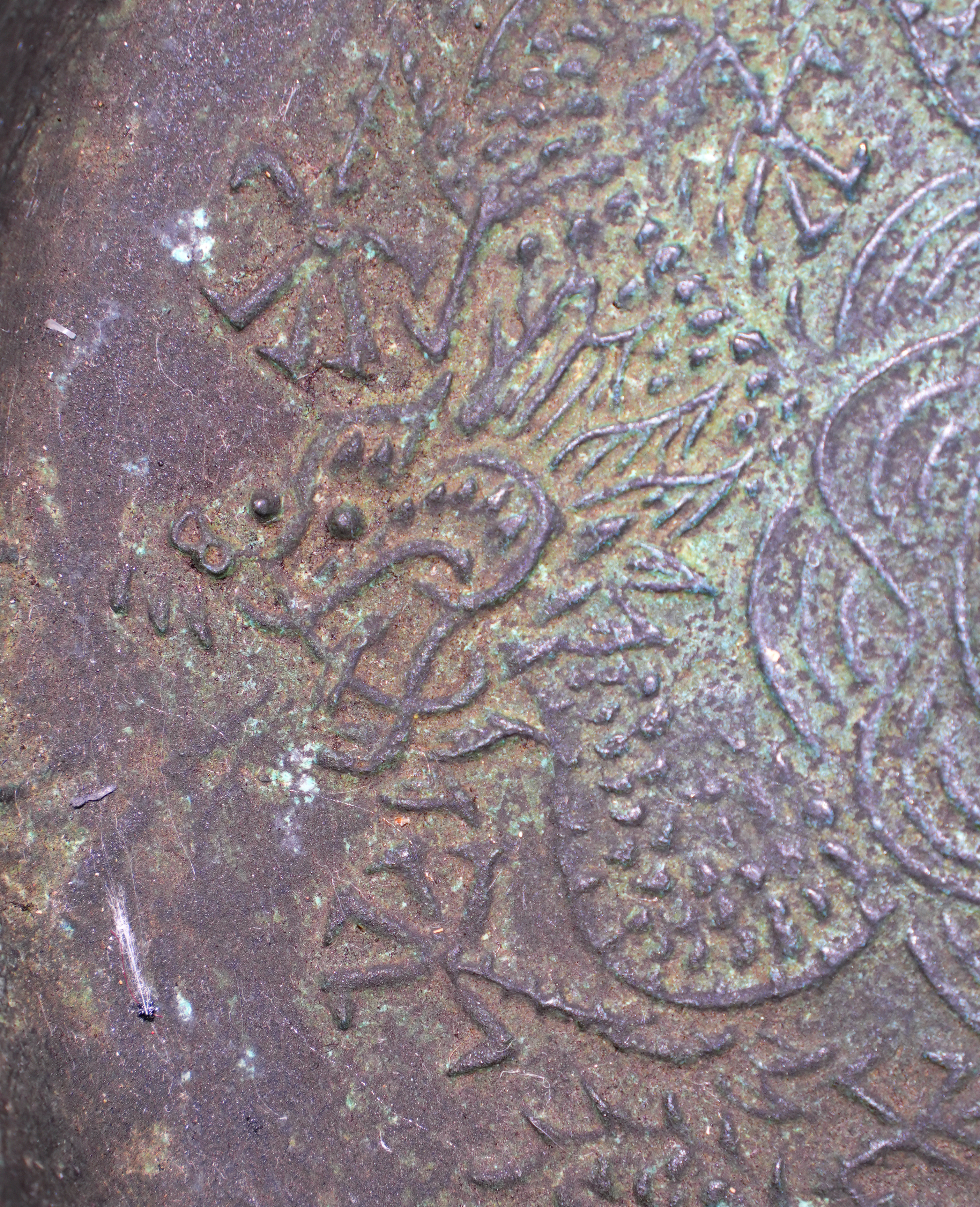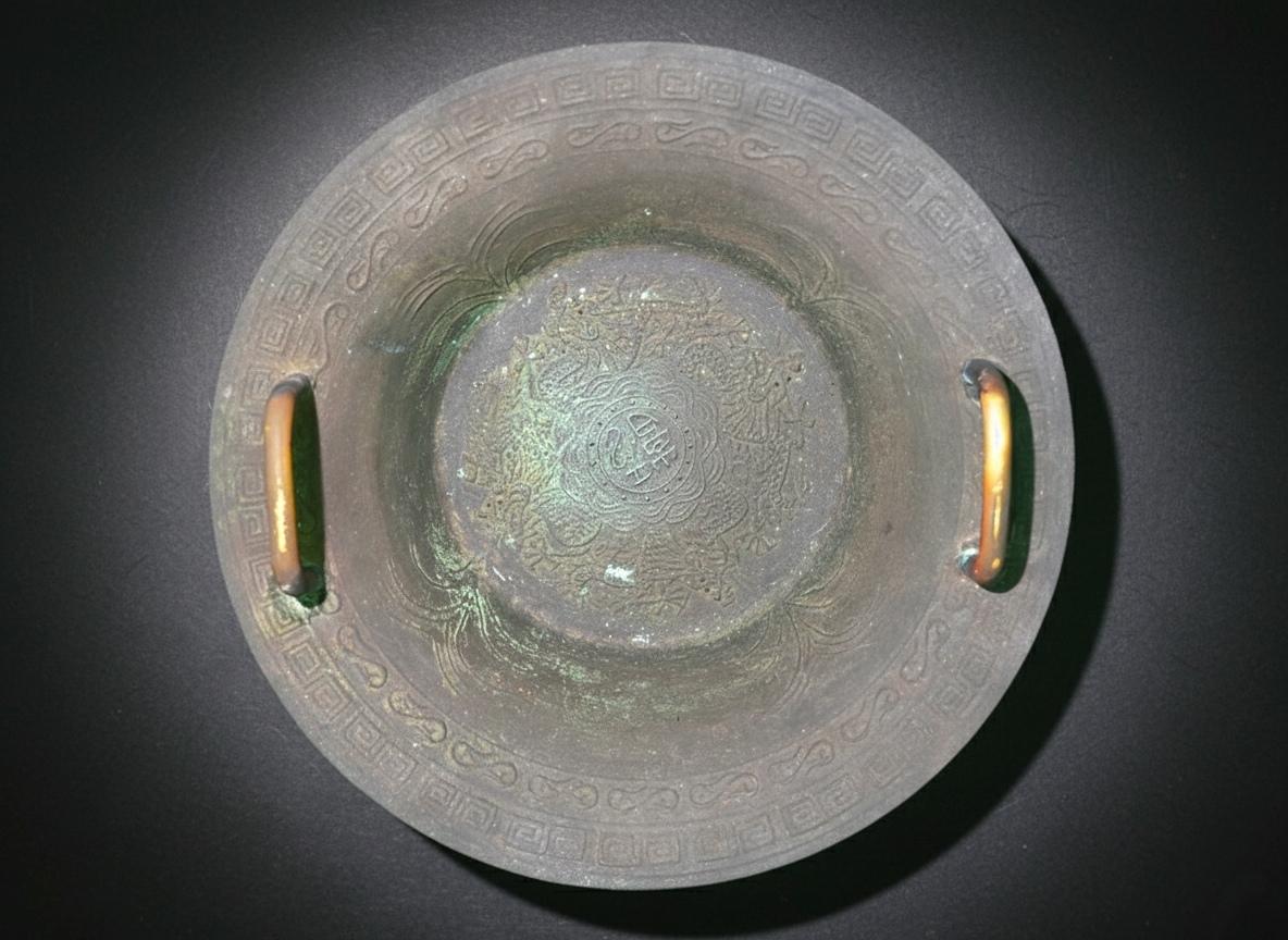 盘底浮雕龙纹,线条遒劲,鳞片细致,龙首昂扬,腾跃于器身之中,神态威严而灵动。龙在中国传统文化中是皇权与祥瑞的象征,寄托着统御天下、兴盛昌隆的寓意。