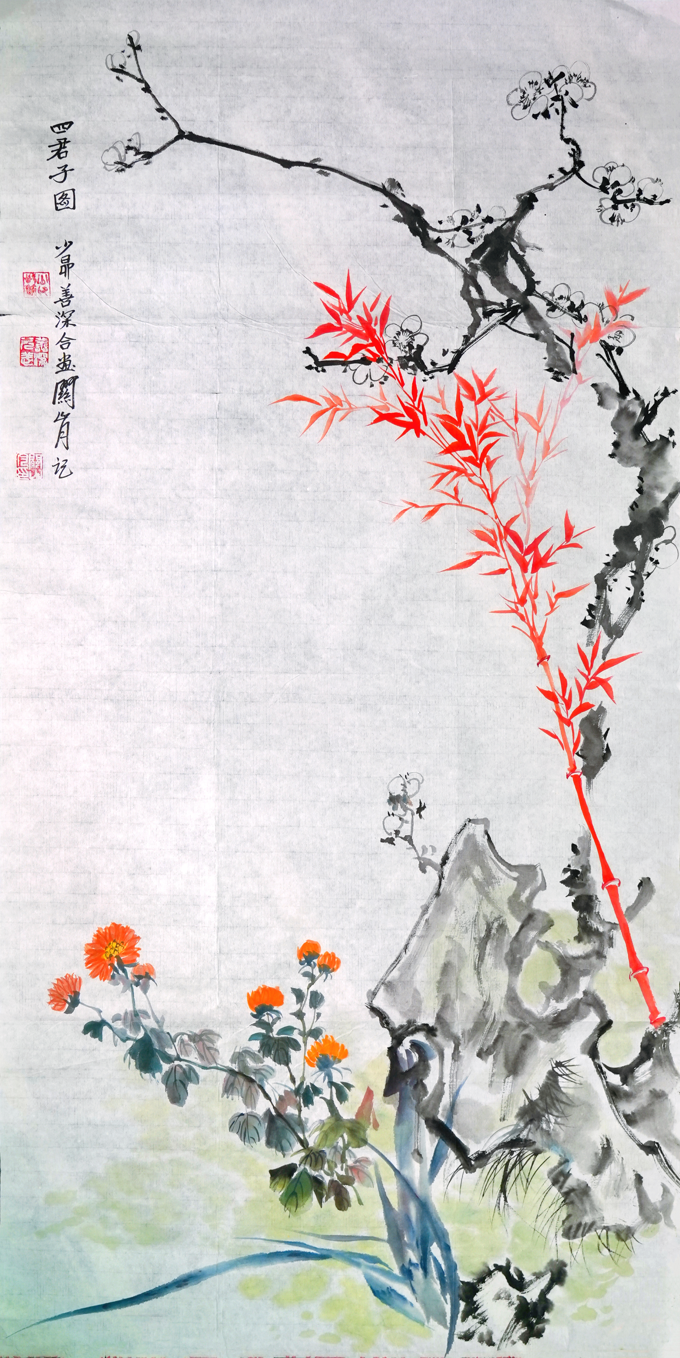 竹:与梅并行的一丛红竹,以朱红入画,突破了传统水墨竹的惯例,既热烈又昂扬,彰显创新精神。