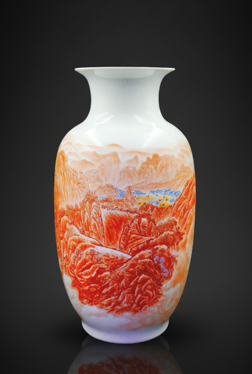 此瓶以“井冈山”为题,山石雄峻、云雾缭绕,松柏挺立,寓意坚毅不屈。色彩层次清雅,意境深远。
