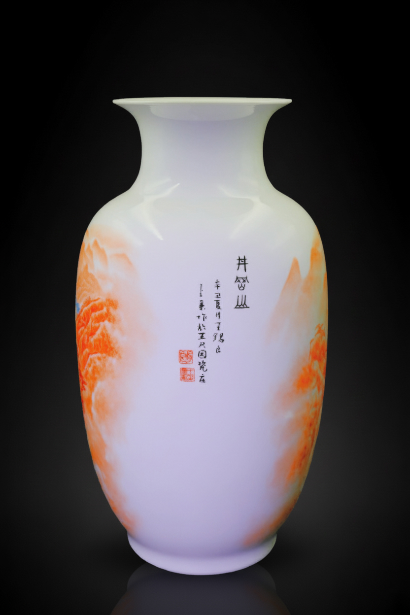 此瓶以“黄山四千仞”为题,描绘黄山奇峰峻岭的雄伟气势。山势层叠起伏,云雾缭绕,松柏挺立,展现自然之壮丽与生命之坚韧。色彩清雅、意境深远,诗情与画意交融,尽显王锡良深厚的艺术修养。