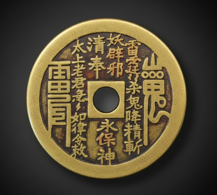 这一面神咒环绕中央方孔,布局均衡,法力之气自内而发。古人佩戴或悬挂此钱,意在祈求天威庇佑、永保安宁。
