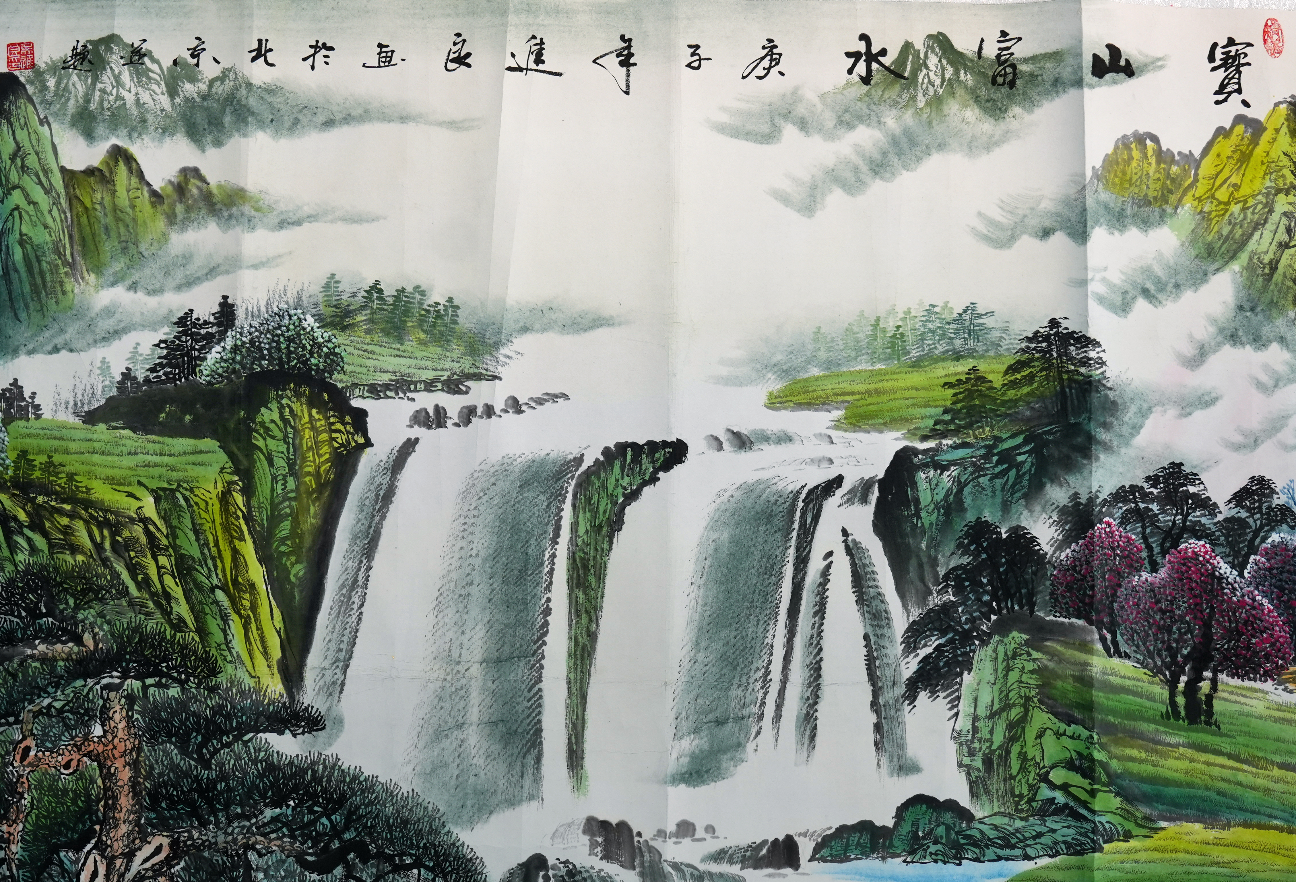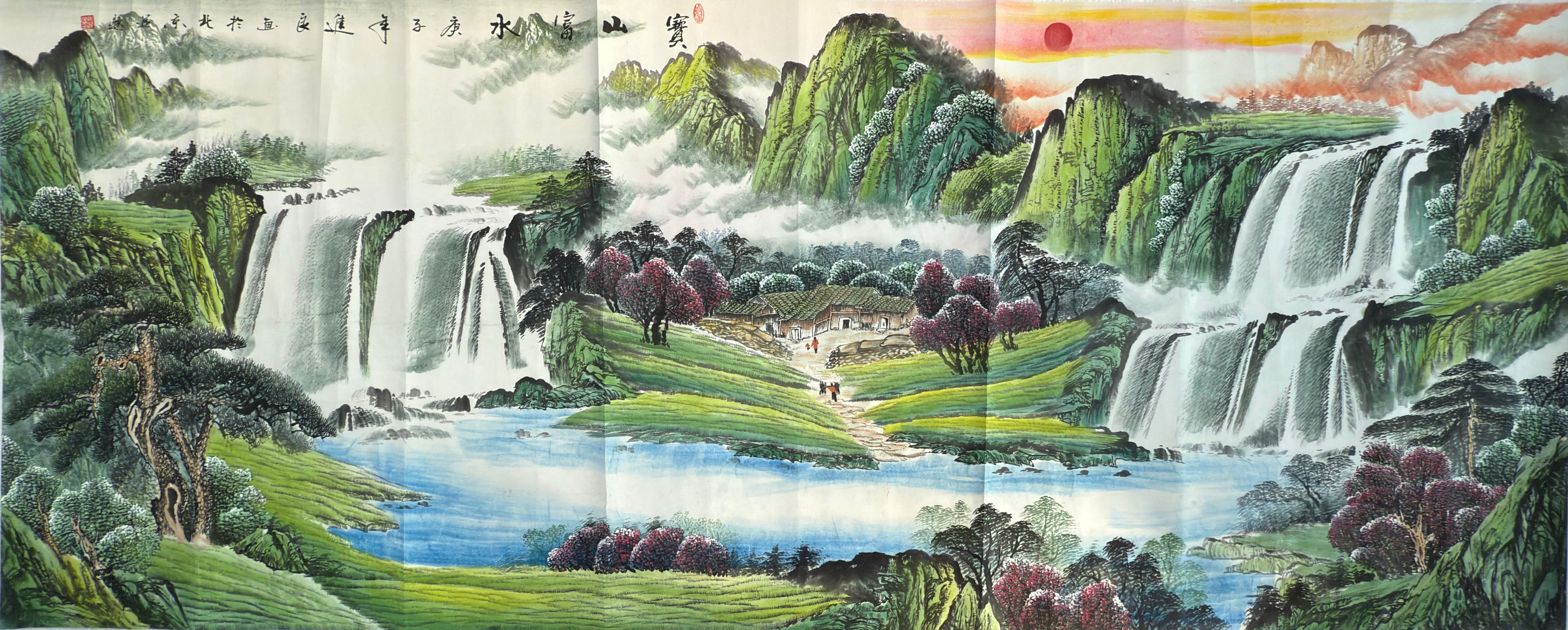 吴进良的《宝山富水图》是一幅气势磅礴、色彩鲜明的现代山水画作,尺幅巨大(236cm × 95.5cm),以丰富的景物细节展现了画家对自然景观的独到理解与热情礼赞。