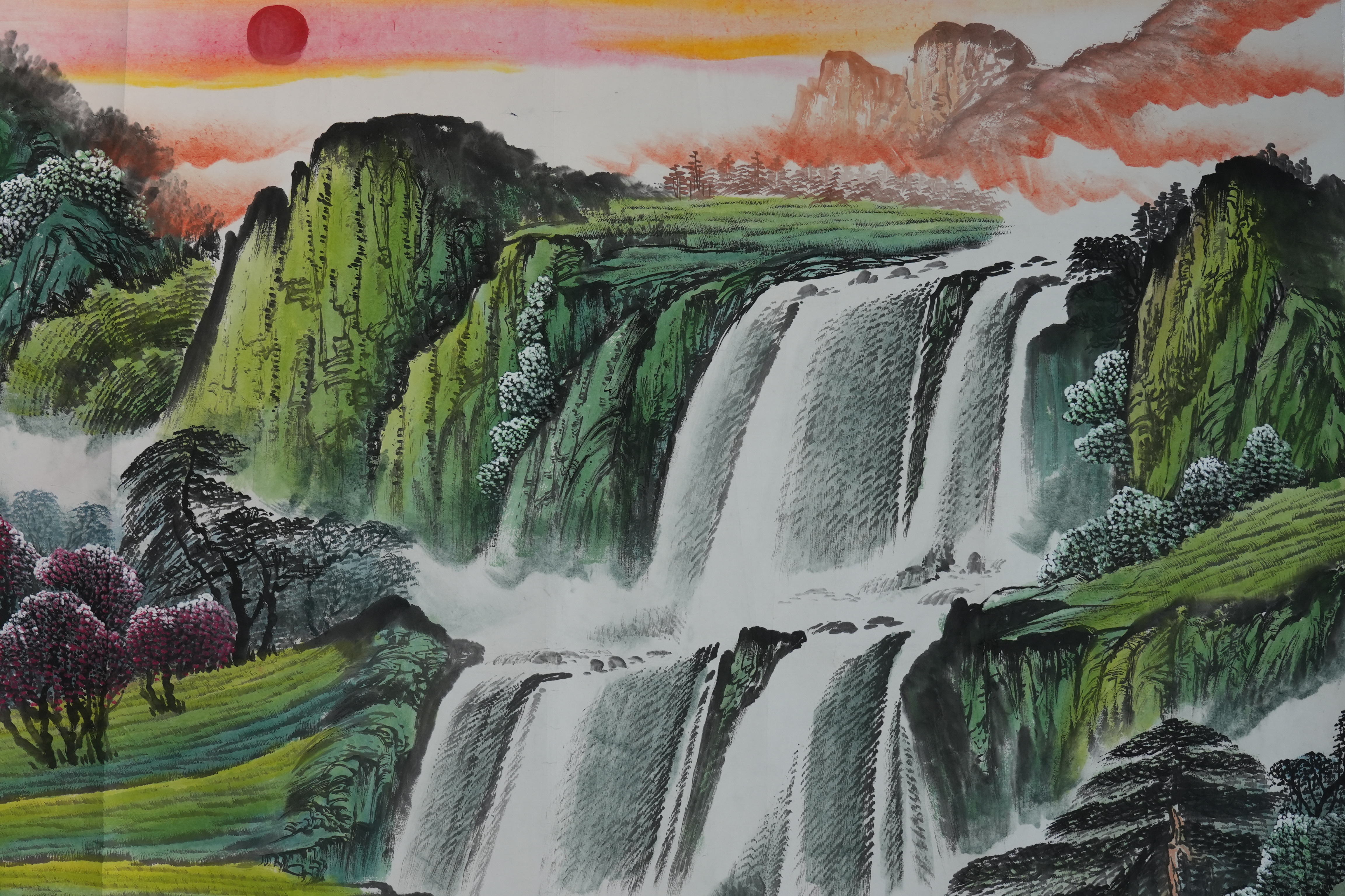 画作采用全景式构图,将雄伟的山川、奔腾的瀑布、静谧的居所与蜿蜒河流浓缩于一纸之上。画面自左至右徐徐展开,云雾缭绕,瀑布从高崖倾泻而下,水流激荡、声势浩大,既保留了传统山水的“可行、可望、可居、可游”意境,又融入现代水墨的鲜活生命力,带来强烈视觉冲击。