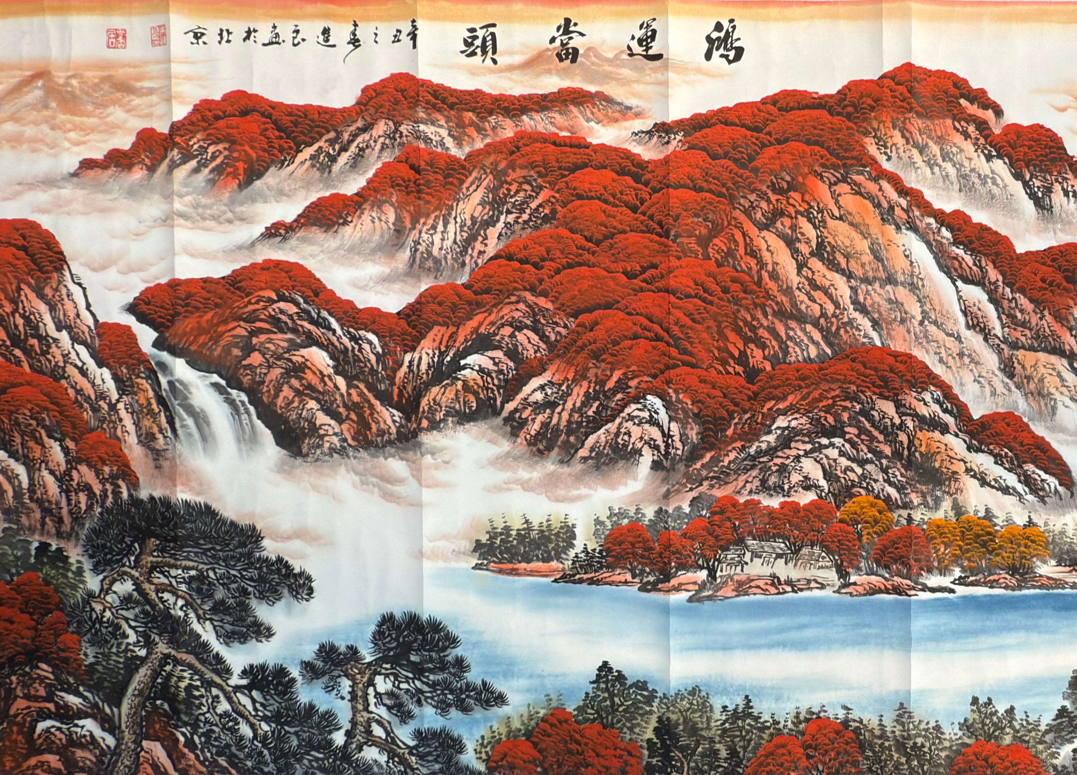 这幅《鸿运当头图》的现代山水画,是艺术家吴进良的代表作之一。作品尺寸宏大,规格为235.5 cm