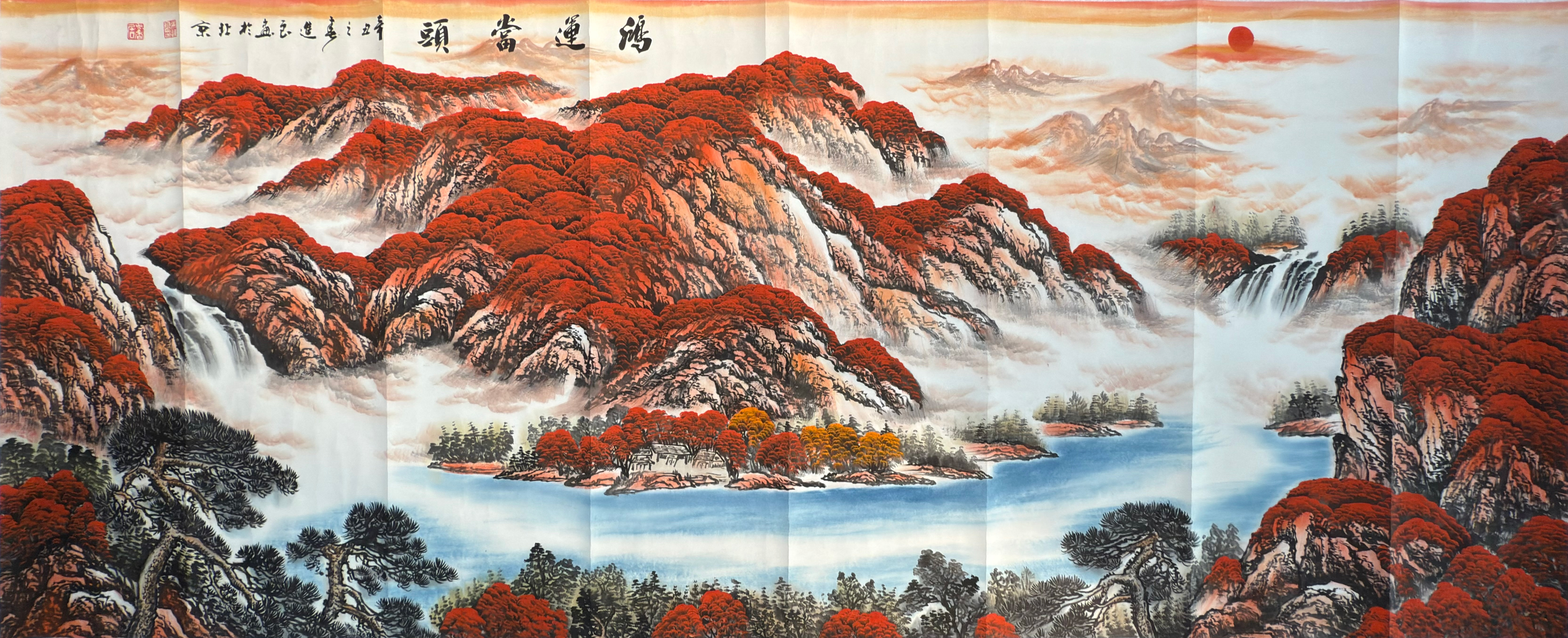 展现了作品的核心视觉元素:连绵起伏、呈鲜亮朱红色调的山脉占据了画面的大部分,象征着“鸿运当头”的吉祥寓意。这些山体并非单一平涂,而是通过墨色、淡彩的晕染,呈现出山石的嶙峋肌理和植被的层次感,红叶满山,生机勃勃。山谷和峰峦间,白色的云雾弥漫,虚实相生,既增加了画面的空间感,又营造出仙境般的神秘氛围。