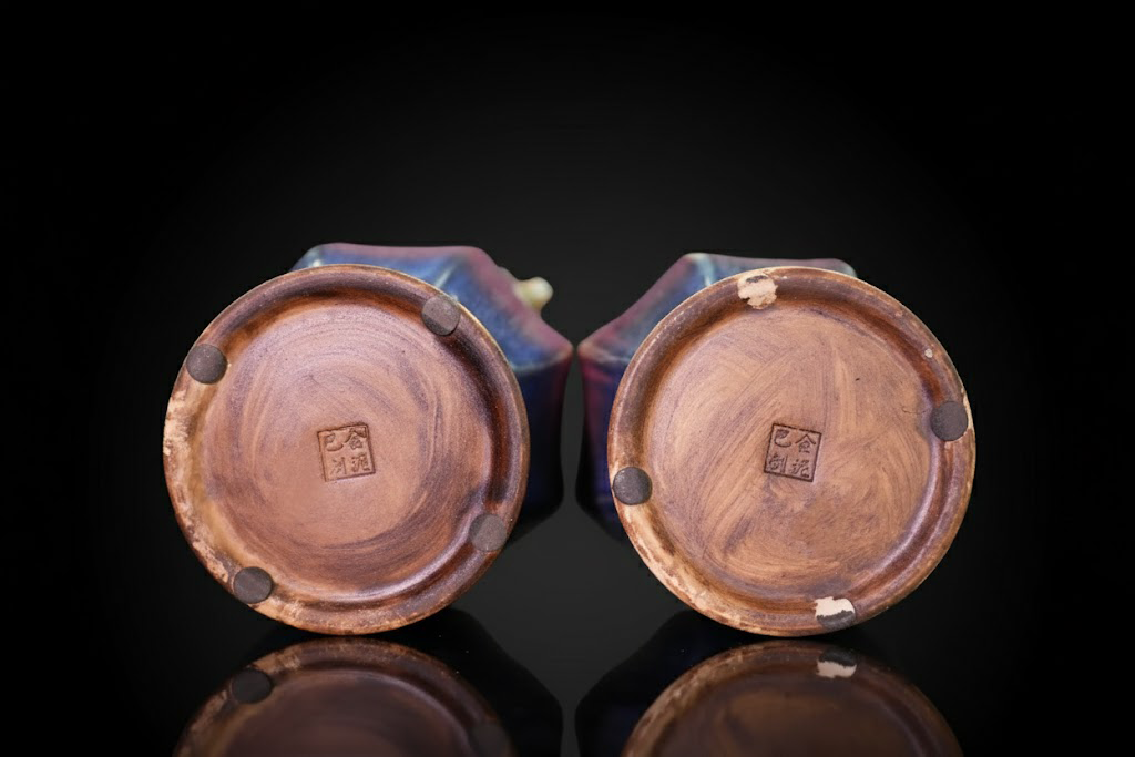清代仿钧釉之盛始于雍正,臻于乾隆,由督陶官唐英主持烧造,继承宋钧“入窑一色,出窑万彩”之精神,又融入宫廷审美之华贵典雅。此对双夔龙耳八分观音瓶,不仅体现出清代高温窑变釉工艺的成熟技艺,更蕴含时代审美与文化意趣。