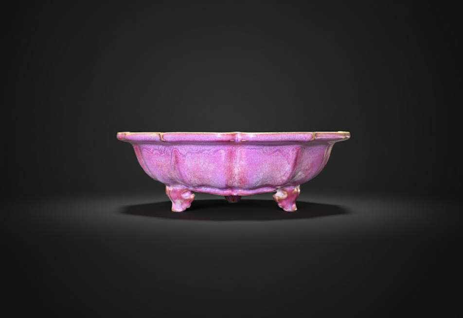 此件钧窑玫瑰紫莲花口三足洗,宋代烧造,口径25cm,底径14.5cm,高8cm。整器造型端庄典雅,口呈盛开的莲花形,瓣口起伏婉转,曲线柔美自然。腹部外壁起凸莲瓣纹,底设三足承托,足呈兽蹄状,比例稳健,结构匀称,展现出宋代工匠追求“天圆地方、曲直相生”的造型美学。