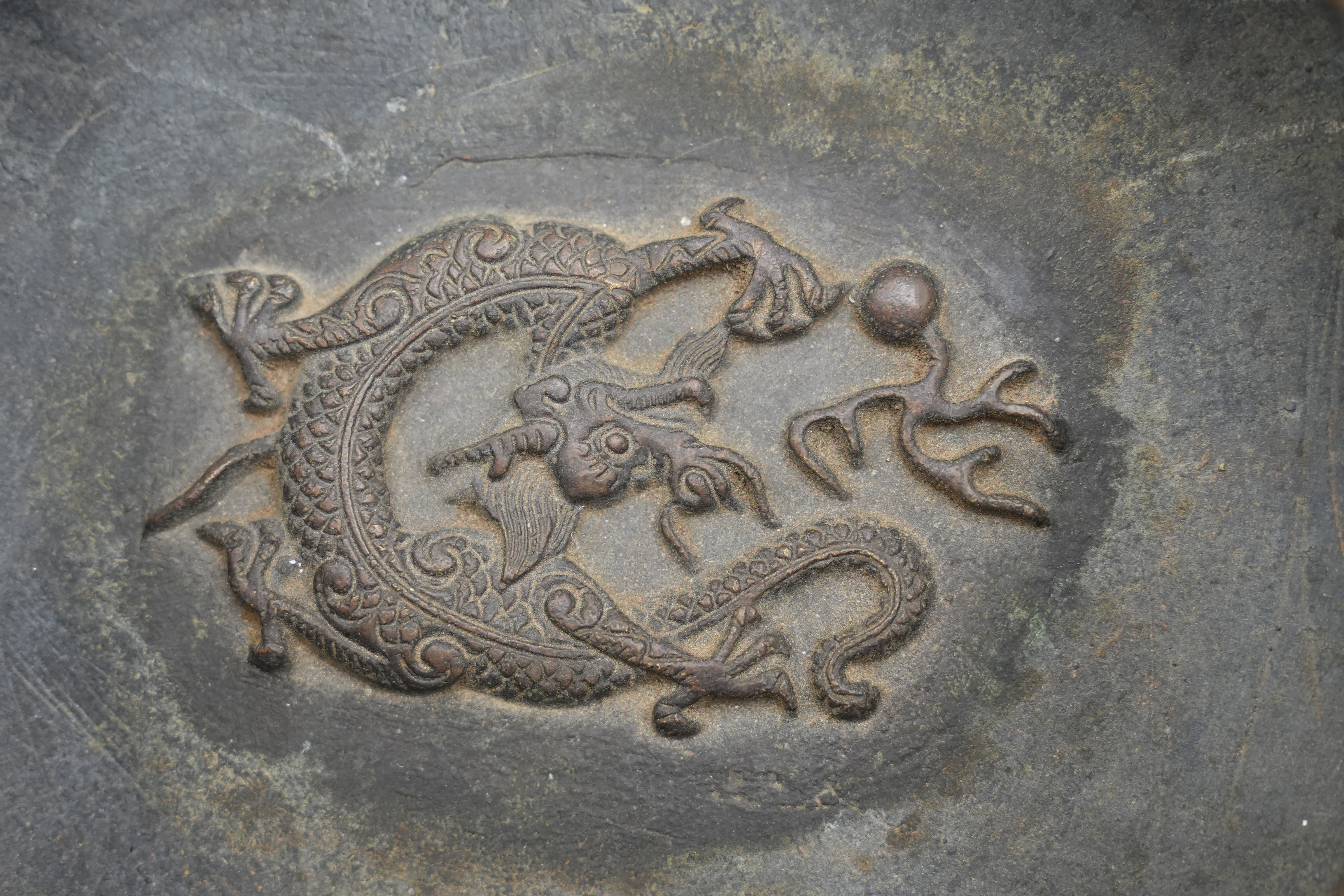 龙身盘旋腾起,五爪舒张,鳞片分明,神态威武。其口衔宝珠,寓意尊贵祥瑞。雕工精湛,浮雕层次分明,表现出清代铸铜工艺的极致之美。