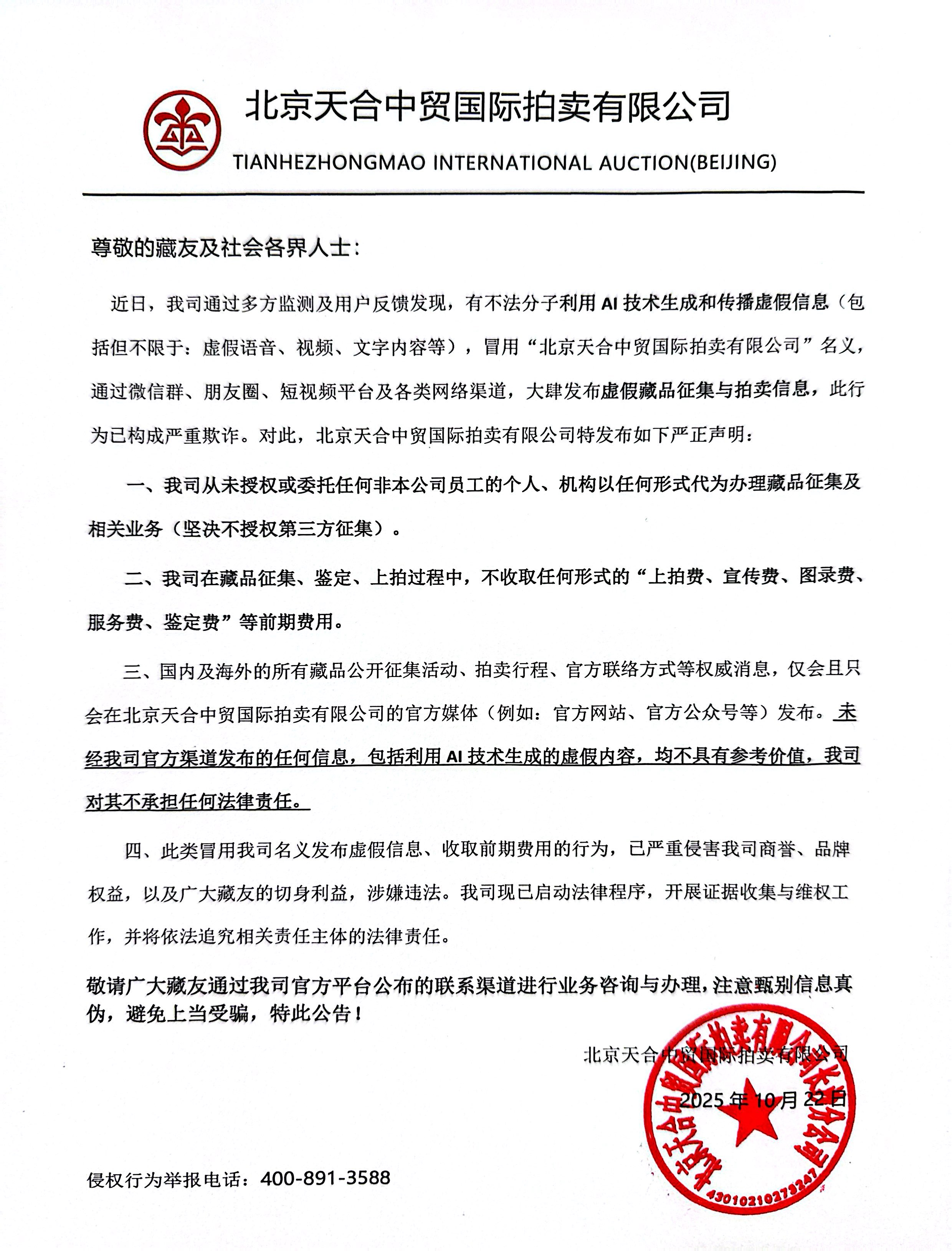 近日,我司通过多方监测及用户反馈发现,有不法分子利用AI技术生成和传播虚假信息(包括但不限于:虚假语音、视频、文字内容等),冒用“北京天合中贸国际拍卖有限公司”名义,通过微信群、朋友圈、短视频平台及各类网络渠道,大肆发布虚假藏品征集与拍卖信息,此行为已构成严重欺诈。对此,北京天合中贸国际拍卖有限公司特发布如下严正声明: