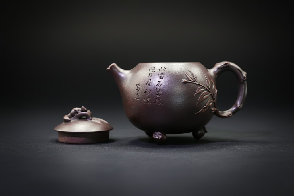 这件紫砂竹节三足壶造型端庄稳重,壶身呈扁圆鼓腹状,下承三乳足,短流,耳形把手以竹节为意象,自然曲折,线条流畅。壶身一侧雕刻竹枝,另一侧则镌刻铭文诗句“秋雷石罂破,晓日丹砂烂”,字体遒劲有力,意境悠远。