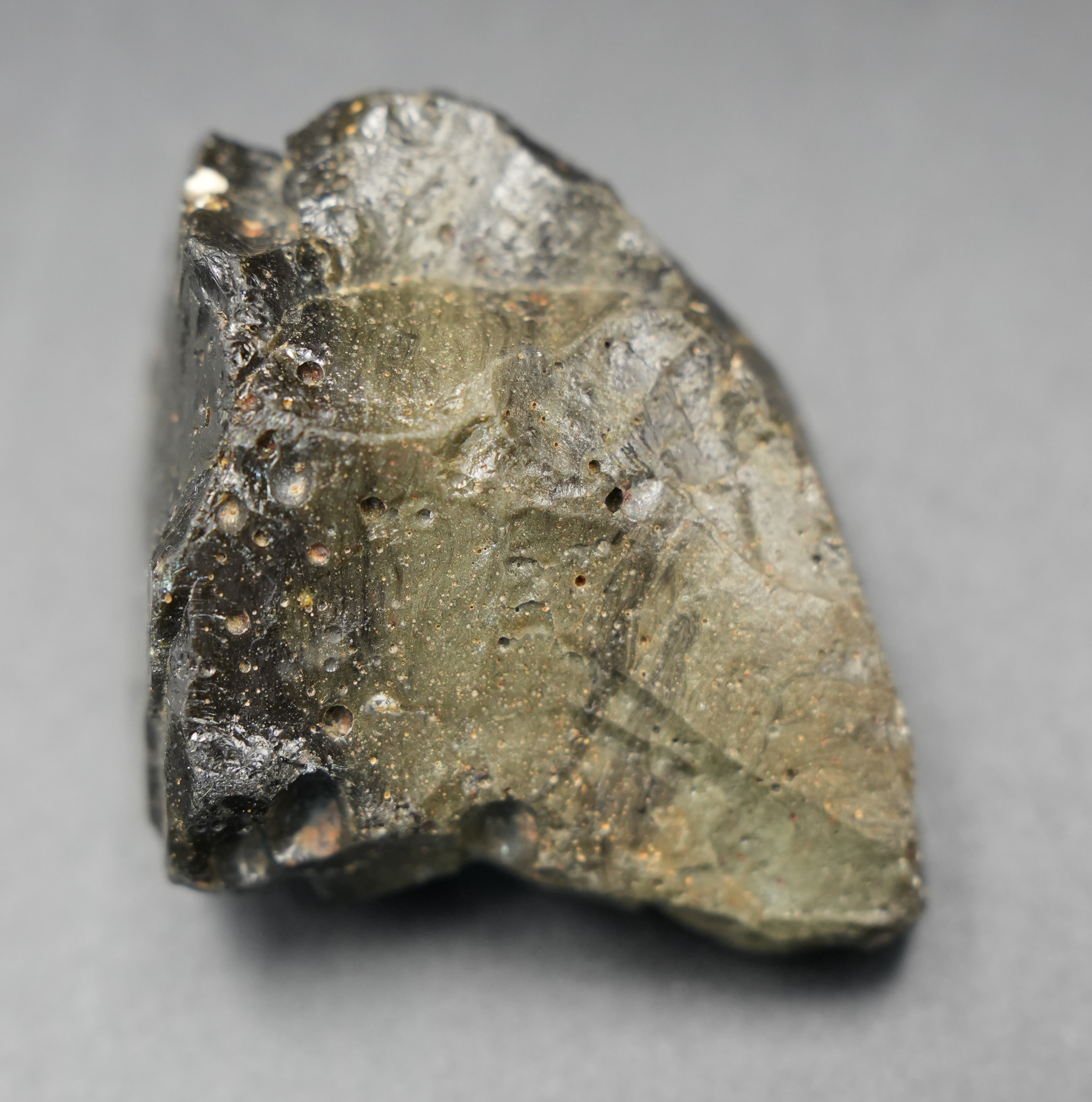 主体色调从暗绿到棕绿,表面有光滑的玻璃光泽,也有粗糙质感。熔融流线和细小气孔(气泡)清晰可见,凹陷如熔蚀坑或气印,正是陨石高速穿越大气层时,气流摩擦与燃烧作用形成的独特形态,是玻璃陨石最典型的标志之一。